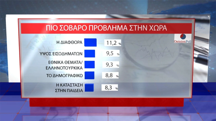 Εκτός από την ακρίβεια, πρόβλημα θεωρείται η οικονομία/ανάπτυξη σε ποσοστό 30%, η κατάσταση στο ΕΣΥ 14,1%, η απονομή Δικαιοσύνης και το Κράτος Δικαίου 12,8%, οι τιμές και το κόστος ενέργειας 11,6%, η διαφθορά 11,2%, το ύψος των εισοδημάτων 9,5%, τα εθνικά και τα ελληνοτουρκικά 9,3%, το δημογραφικό 8,8%, ενώ χαμηλά βρίσκονται ως προβλήματα η κατάσταση στην Παιδεία (8,3%), η στεγαστική κρίση (7,5%), το Μεταναστευτικό (7,3%), η εγκληματικότητα και τα φαινόμενα βίας (6,9% και η ανεργία (6,6%).