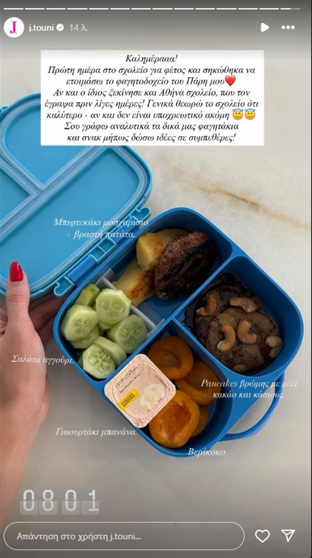 «Καλημέρα! Πρώτη ημέρα στο σχολείο για φέτος και σηκώθηκα να ετοιμάσω το φαγητοδοχείο του Πάρη μου. Αν και ο ίδιος ξεκίνησε και Αθήνα σχολείο, που τον έγραψα πριν λίγες ημέρες! Γενικά θεωρώ το σχολείο ότι καλύτερο – αν και δεν είναι υποχρεωτικό ακόμη. Σου γράφω αναλυτικά τα δικά μας φαγητάκια και σνακ μήπως δώσω ιδέες σε συμπεθέρες», έγραψε η Ιωάννα Τούνη στην ανάρτησή της.