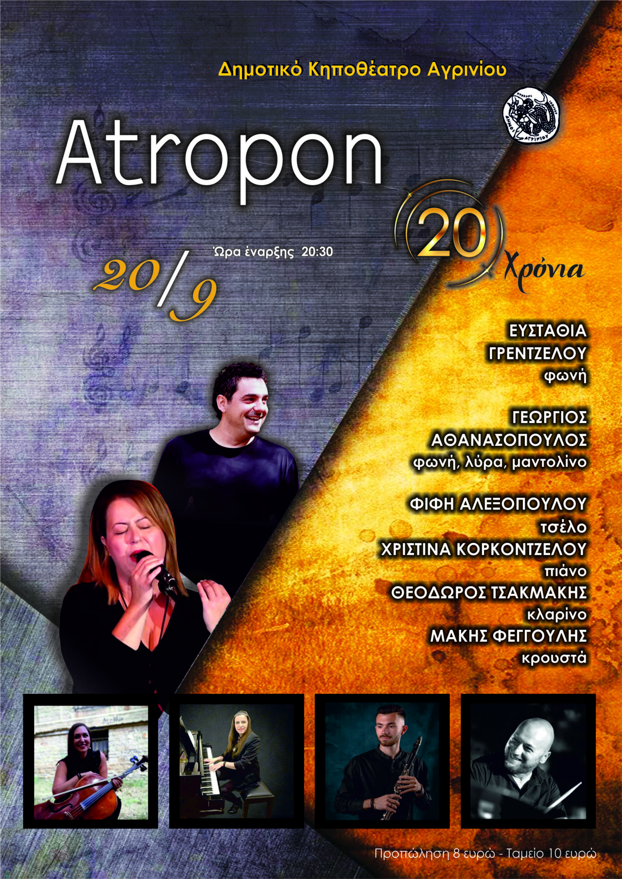 Επετειακή συναυλία «20 χρόνια Atropon» στο Δημοτικό Κηποθέατρο Αγρινίου, με μουσικές διαφορετικών ρευμάτων, αγαπημένους καλλιτέχνες και μια γιορτινή ατμόσφαιρα.