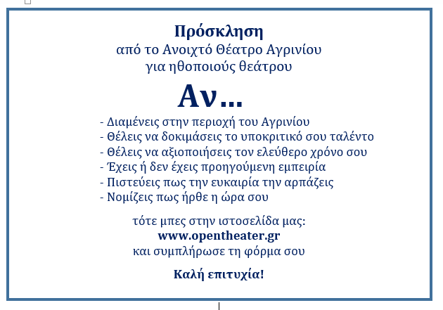 Η νέα θεατρική σεζόν 2025-26 ξεκίνησε και το Θεατρικό Τμήμα Ανοιχτού Θεάτρου Αγρινίου, απευθύνει πρόσκληση σε άνδρες και γυναίκες, ερασιτέχνες ηθοποιούς, ηλικίας 25-50 ετών από την περιοχή του Αγρινίου, για τη νέα του θεατρική παράσταση.