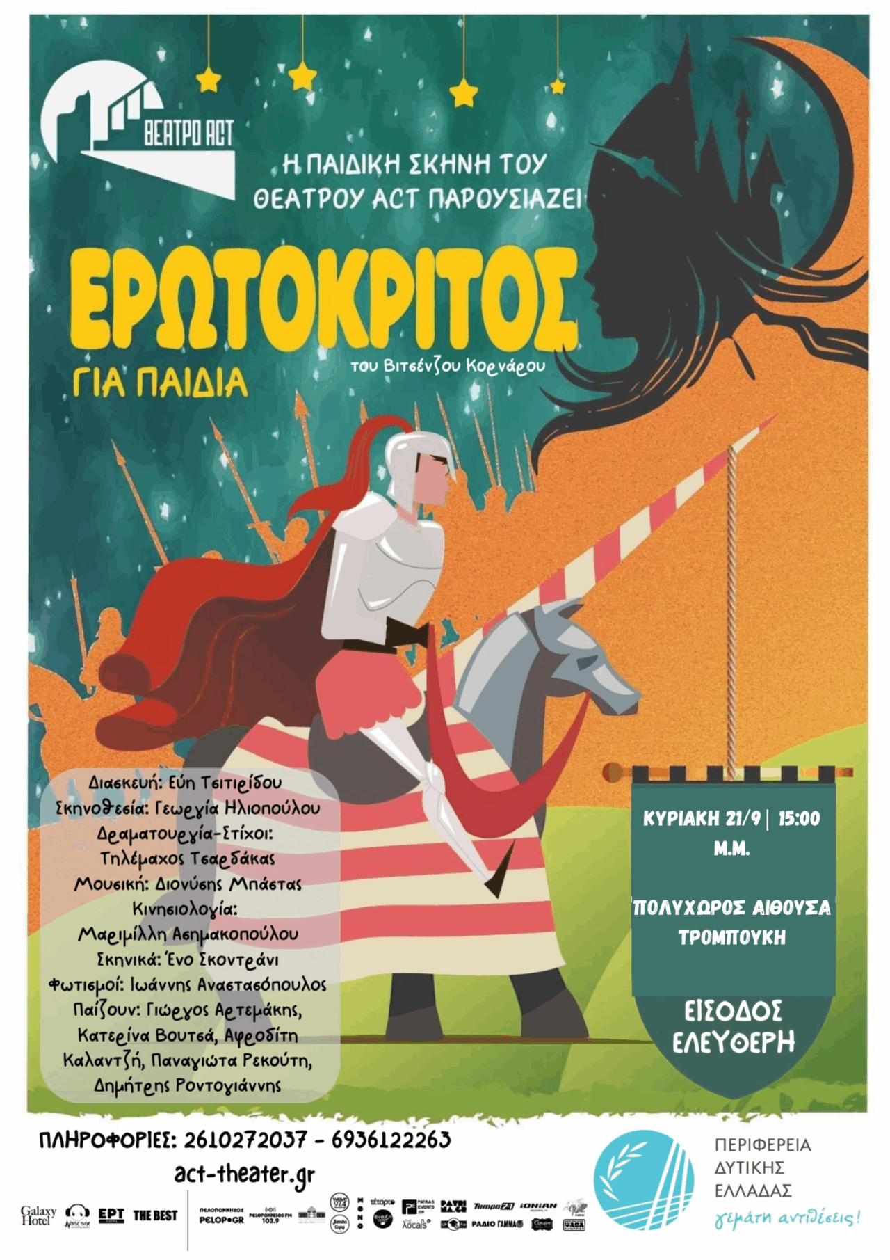 Ο Δήμος Αμφιλοχίας φιλοξενεί την Κυριακή 21 Σεπτεμβρίου στις 15:00 στην Αμφιλοχία την παράσταση του κλασσικού έργου «Ερωτόκριτος» που παρουσιάζουν η Περιφέρεια Δυτικής Ελλάδας σε συνεργασία με την επαγγελματική θεατρική ομάδα Κάνθαρος του θεάτρου act.
