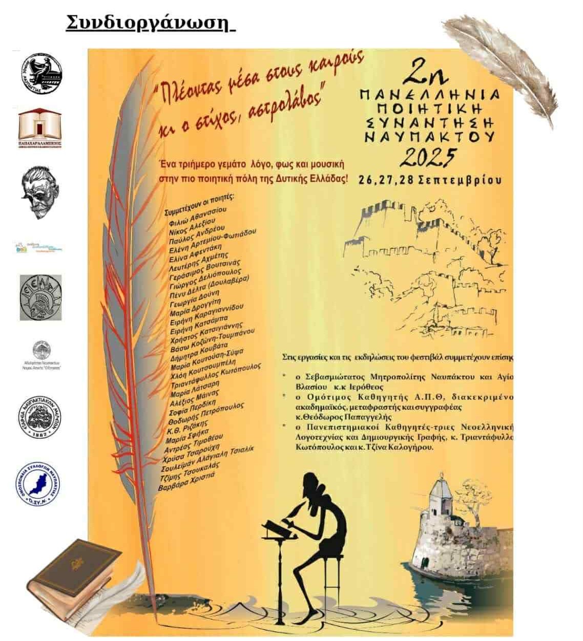 Εκπαίδευσης Αιτωλοακαρνανίας, την Α΄ Ε.Λ.Μ.Ε. Αιτωλοακαρνανίας, την Παπαχαραλάμπειο Δημόσια Κεντρική Βιβλιοθήκη Ναυπάκτου, την Εταιρία Ελλήνων Λογοτεχνών Αμερικής (Ε.Ε.Λ.Α), την Εταιρία Ναυπακτιακών Μελετών (Ε.ΝΑ.Μ), την Ομοσπονδία Συλλόγων Ναυπακτίας, την Αδελφότητα Ναυπακτίων Νομού Αττικής «Ο Έπαχτος», την Καλλιτεχνική Διευθύντρια και την Οργανωτική Επιτροπή της Συνάντησης, σας προσκαλούν στις 26, 27 και 28 Σεπτεμβρίου 2025 στην Ναύπακτο, όπου θα συμμετέχουν 30 διακεκριμένοι ποιητές και ποιήτριες από όλη τη χώρα.