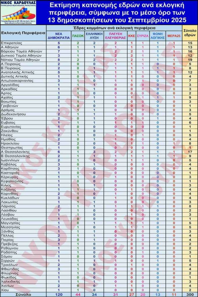 Μια πρόσφατη ανάλυση δημοσκοπήσεων, με βάση την εκτίμηση της κατανομής των εδρών ανά εκλογική περιφέρεια, δημοσιεύθηκε από τον απόστρατο συνταγματάρχη και πολιτικό αναλυτή Νίκο Καρδούλα. Η μελέτη βασίστηκε σε 13 διαφορετικές έρευνες που πραγματοποιήθηκαν τον Σεπτέμβριο του 2025, συνυπολογίζοντας τα ποσοστά και τους μέσους όρους τους.
