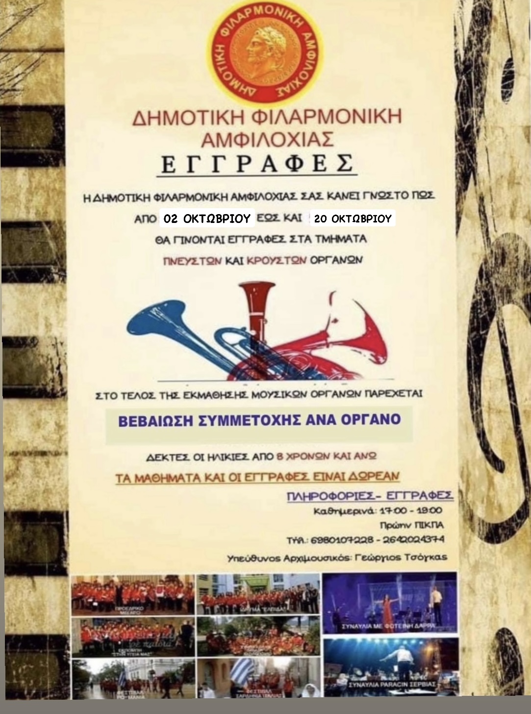 Πηγή: Δημοτική Φιλαρμονική Αμφιλοχίας: Μέχρι τις 20 Οκτωβρίου οι εγγραφές
