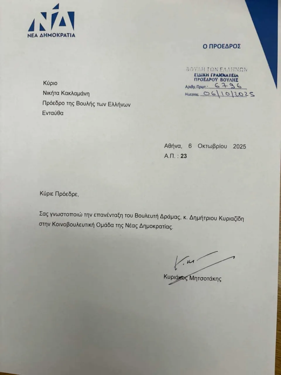Επέστρεψε στη Νέα Δημοκρατία ο Δημήτρης Κυριαζίδης, με την ΚΟ της «γαλάζιας» παράταξης να αριθμεί 156 βουλευτές.