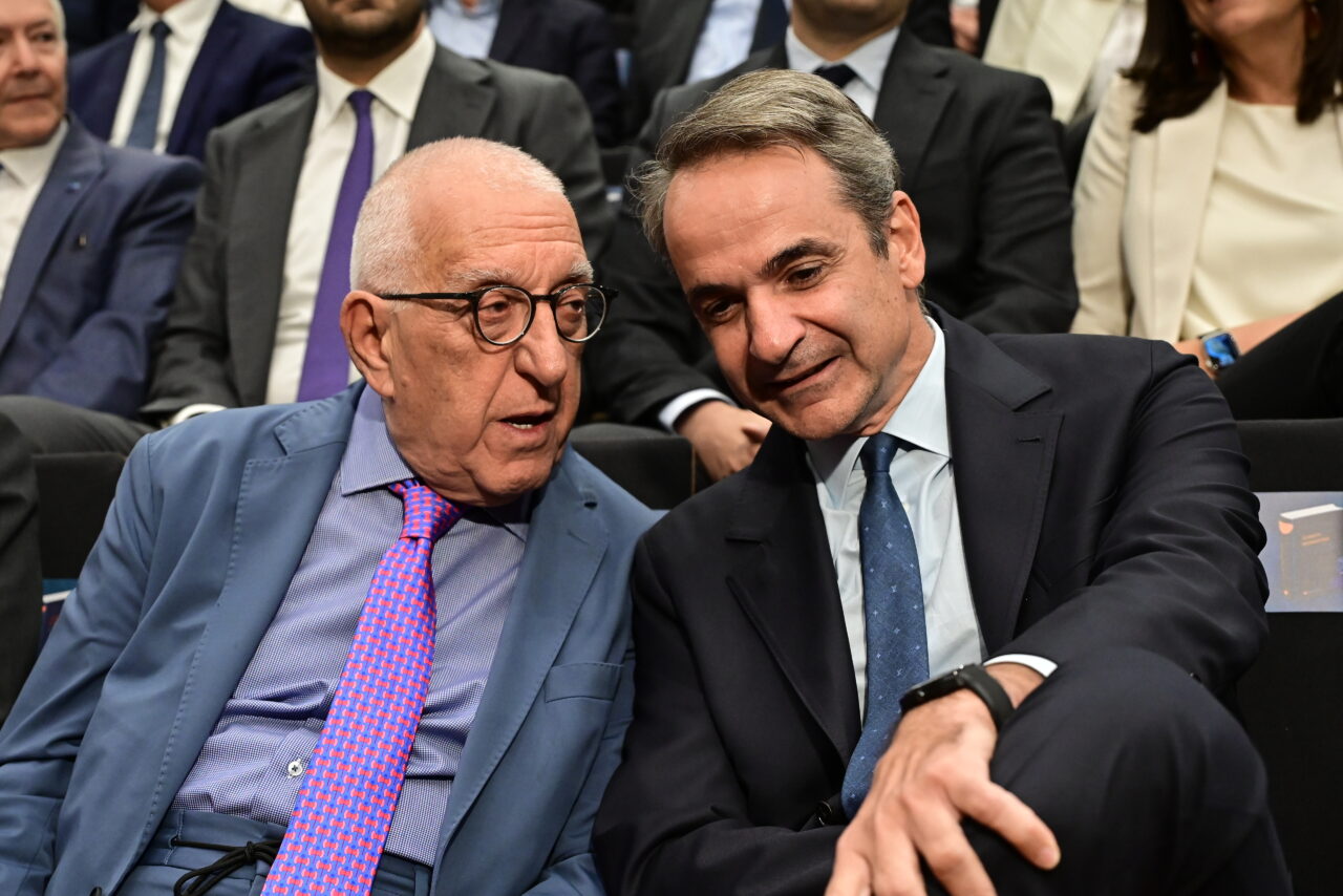 Στην παρουσίαση του βιβλίου του Ευριπίδη Στυλιανίδη που πραγματοποιείται στο Ωδείο Αθηνών εκτυλίχθηκε ο χαιρετισμός μεταξύ Κυριάκου Μητσοτάκη και Κώστα Καραμανλή.