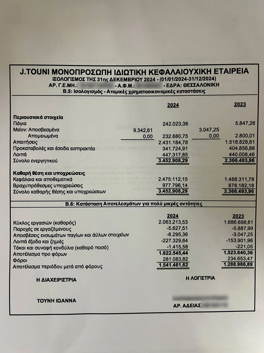 Ο ισολογισμός της εταιρείας της, J. TOUNI Μονοπρόσωπη Ι.Κ.Ε., για το οικονομικό έτος 2024 δείχνει μια επιχείρηση με εξαιρετικά οικονομικά μεγέθη: κύκλος εργασιών 2.063.213,53 ευρώ – αυξημένος κατά 22,3% σε σχέση με το 2023 και καθαρά κέρδη μετά φόρων 1.541.461,62 ευρώ.