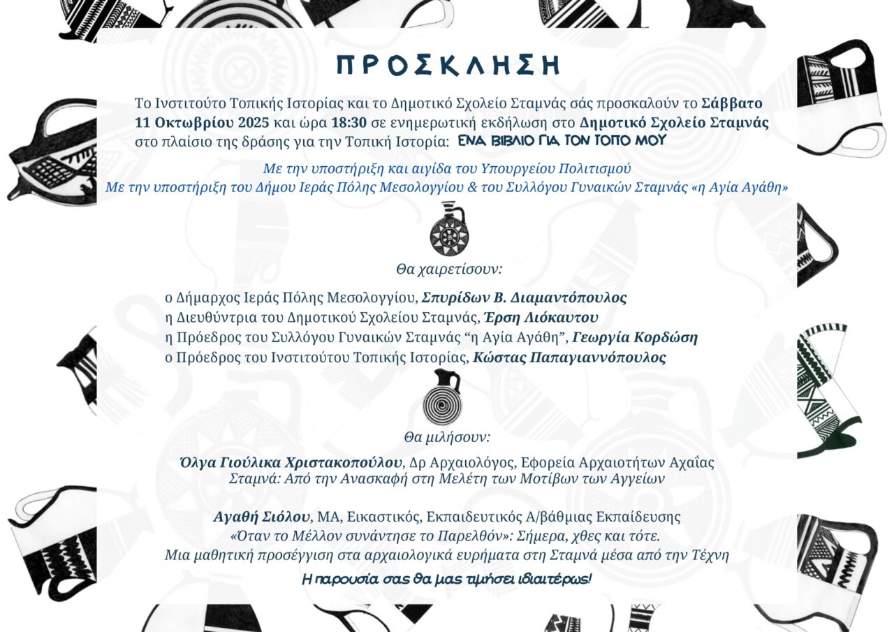 Το Ινστιτούτο Τοπικής Ιστορίας και το Δημοτικό Σχολείο Σταμνάς σας προσκαλούν το Σάββατο 11 Οκτωβρίου 2025 και ώρα 18:30 σε ενημερωτική εκδήλωση στο Δημοτικό Σχολείο Σταμνάς στο πλαίσιο της δράσης για την Τοπική Ιστορία: «Ένα βιβλίο για τον τόπο μου»