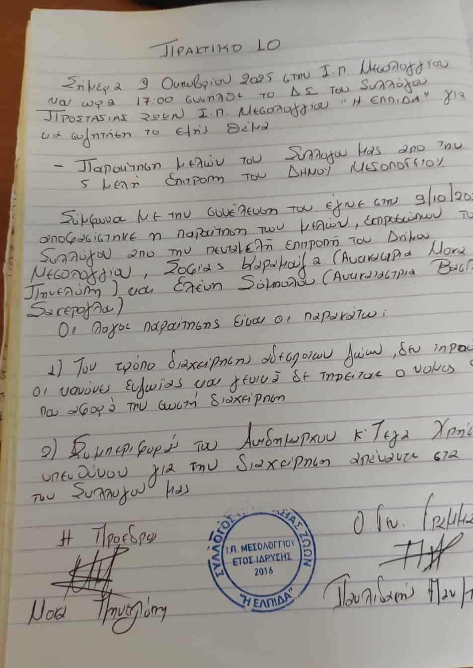 Παραιτήθηκαν στο Μεσολόγγι τα μέλη του Συλλόγου Προστασίας Ζώων «Η Ελπίδα», από επιτροπή του Δήμου, καταγγέλοντας την απαράδεκτη συμπεριφορά του αντιδημάρχου κ. Τέγα προς τα μέλη του Συλλόγου.