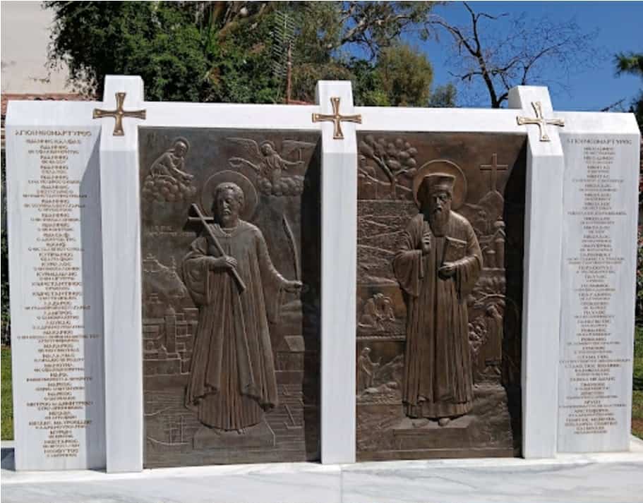 Στο μνημείο, όπως φαίνεται στη φωτογραφεία, είναι γραμμένα δεκάδες ονόματα νεομαρτύρων, στο κεντρικό μνημείο υπάρχουν δύο Άγγελοι κρατώντας στεφάνι, αριστερά και δεξιά δεσπόζουν, η Αγία Φιλοθέη η Αθηναία και ο Προστάτης Άγιος μας Πατρο-Κοσμάς ο Αιτωλός, ο Πρόδρομος των Αγωνιστών της Ελευθερίας του Έθνους, 1821.