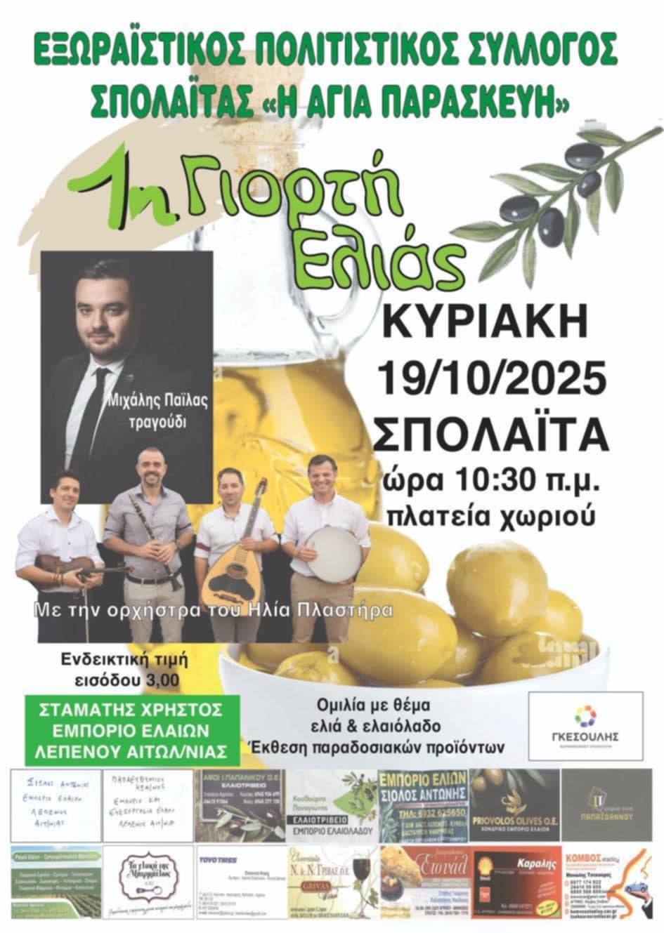 Την Κυριακή (19.10.25) στην πλατεία της Σπολάϊτας θα πραγματοποιηθεί η 1η Γιορτή Ελιάς, όπως αναφέρει η Εφημερίδα «Συνείδηση», μια γιορτή για τον τόπο, τη γη και τους ανθρώπους της.