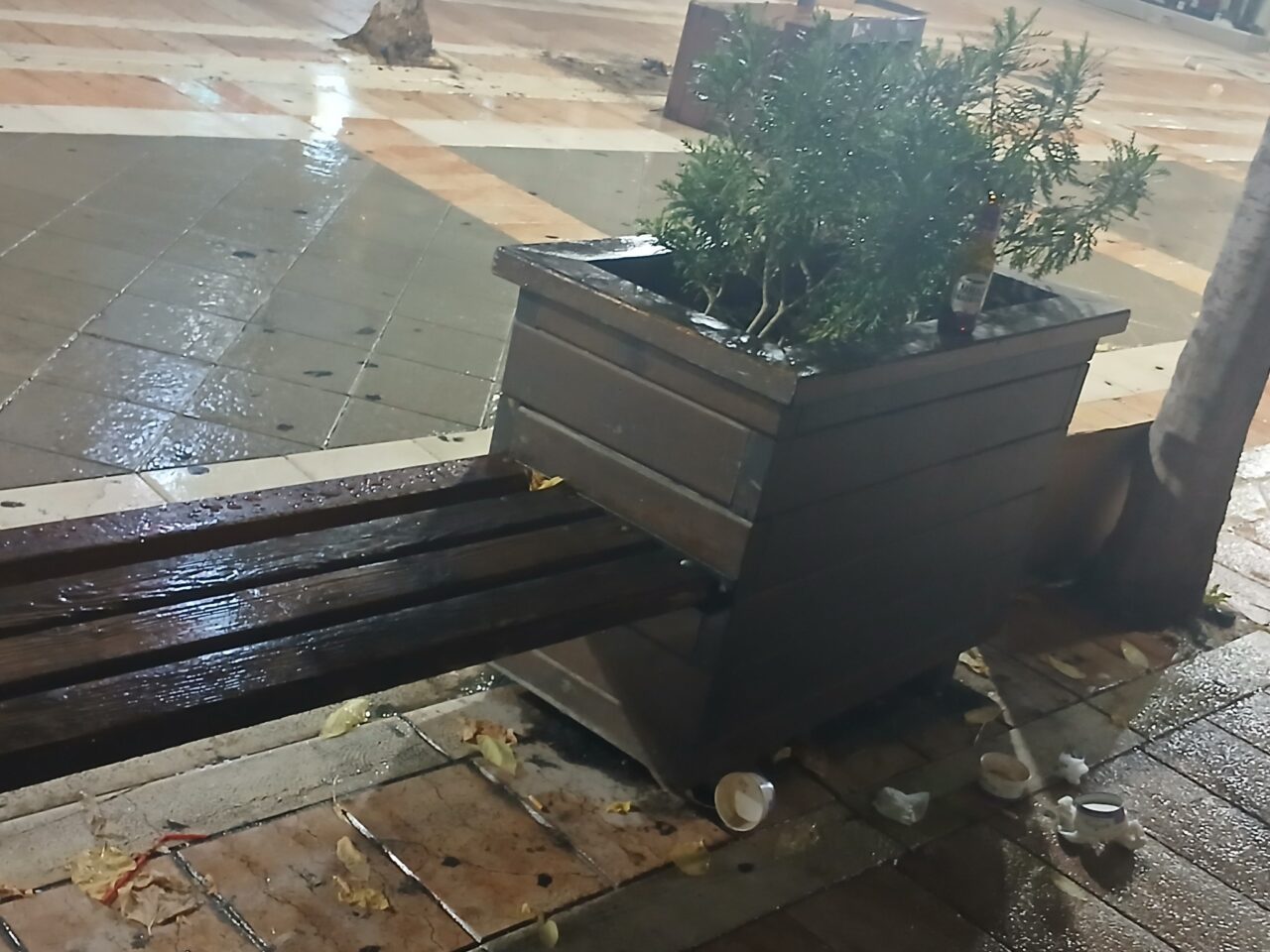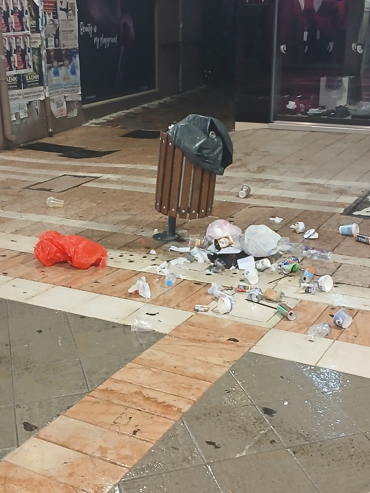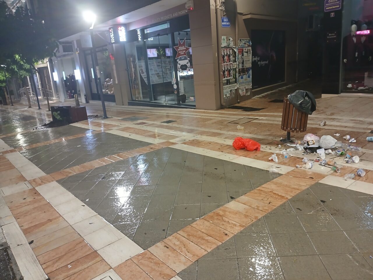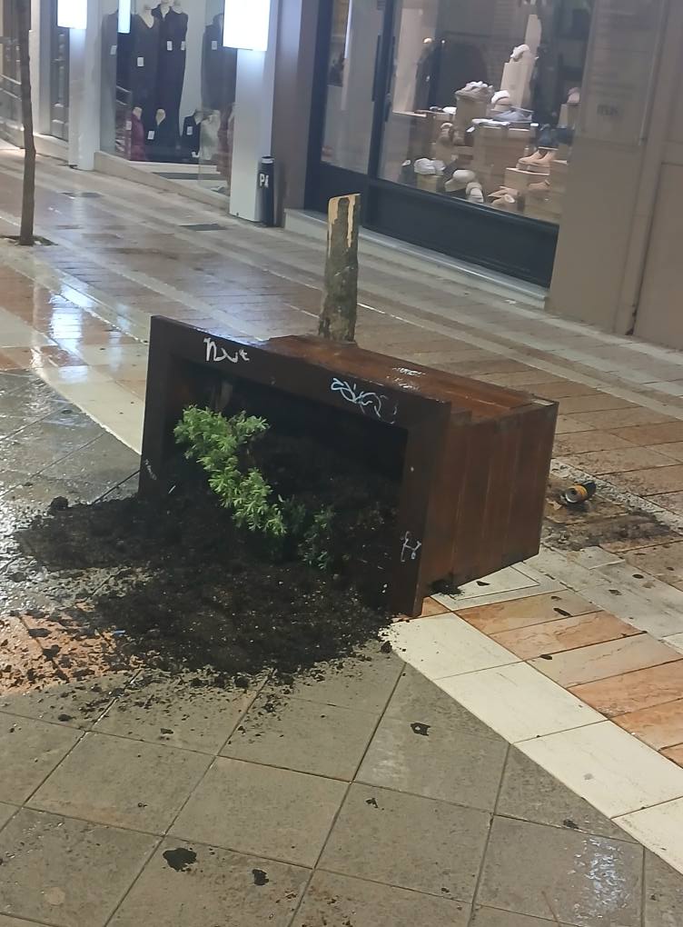 Όποια και αν ήταν η «αιτία», οι βανδαλισμοί που έγιναν τα ξημερώματα της Κυριακής (19.10.25) είχαν ως αποτέλεσμα να καταστραφούν παρτέρια, παγκάκια και κάδοι απορριμμάτων και ο πεζόδρομος να μετατραπεί σε σκουπιδότοπο.
