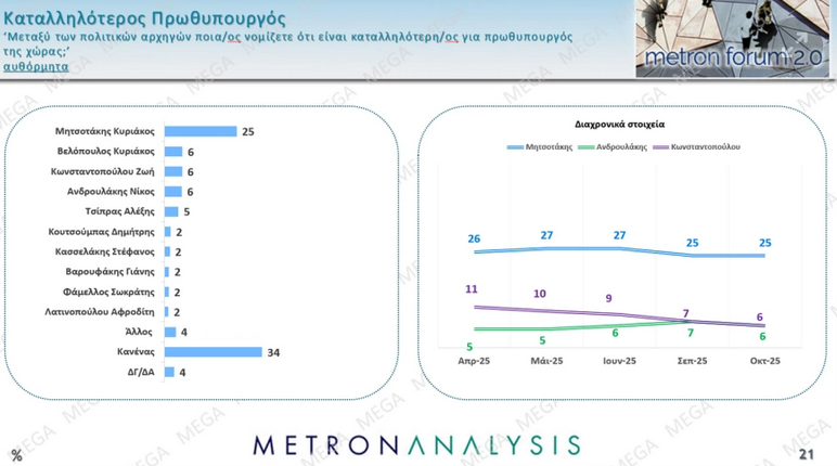 Προβάδισμα 19 μονάδων διατηρεί ο Κυριάκος Μητσοτάκης με 25% στη μέτρηση για τον καταλληλότερο για την πρωθυπουργία μεταξύ των πολιτικών αρχηγών απέναντι στους Κυριάκο Βελόπουλο, Ζωή Κωνσταντοπούλου και Νίκο Ανδρουλάκη που βρίσκονται έκαστος στο 6%.
