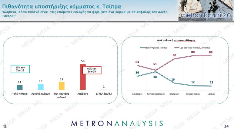 Επίσης το 24% του δείγματος απαντά πως στις επόμενες εκλογές θα μπορούσε να ψηφίσει ένα κόμμα Τσίπρα. Εξ αυτών το 11% το θεωρεί πολύ πιθανό να υποστήριζε μια τέτοια προσπάθεια και το 13% αρκετά πιθανό.