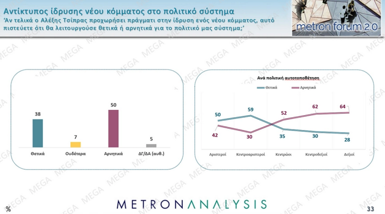 Σχετικά με τον αντίκτυπο που θα έχει στο πολιτικό σύστημα η ίδρυση νέου κόμματος από τον Αλέξη Τσίπρα, το 38% των ερωτηθέντων τοποθετείται θετικά, το 50% αρνητικά, ενώ το 12% προτιμά είτε να μείνει ουδέτερο είτε το «δεν γνωρίζω/δεν απαντώ».
