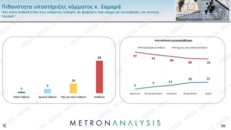 Στο 3% ανέρχονται όσοι είναι «πολύ πιθανό» να στήριζαν ένα κόμμα με επικεφαλής τον Αντώνη Σαμαρά, ενώ μαζί με εκείνους που δηλώνουν «αρκετά πιθανό» να το ψηφίσουν, το ποσοστό ανέρχεται στο 12%.