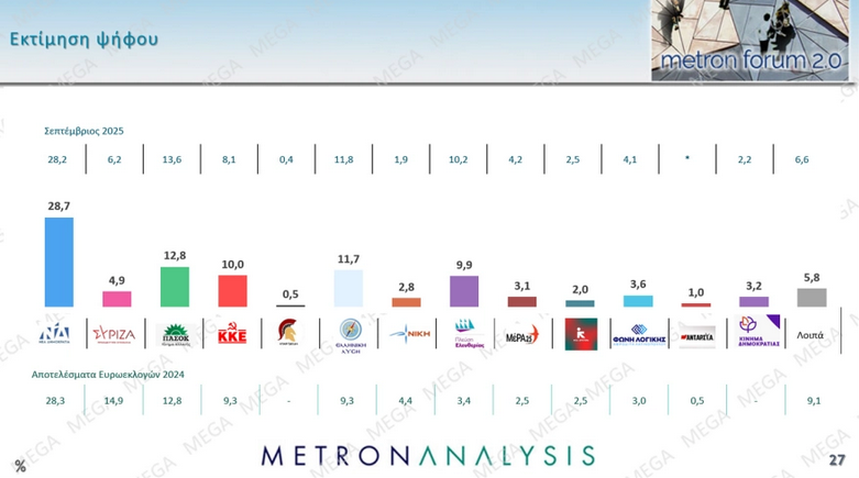 Πηγή: Metron Analysis: Στο 28,7% η ΝΔ, το 24% αγγίζει ο Τσίπρας