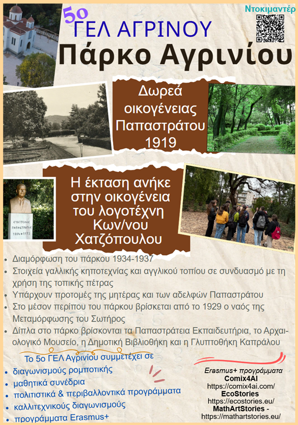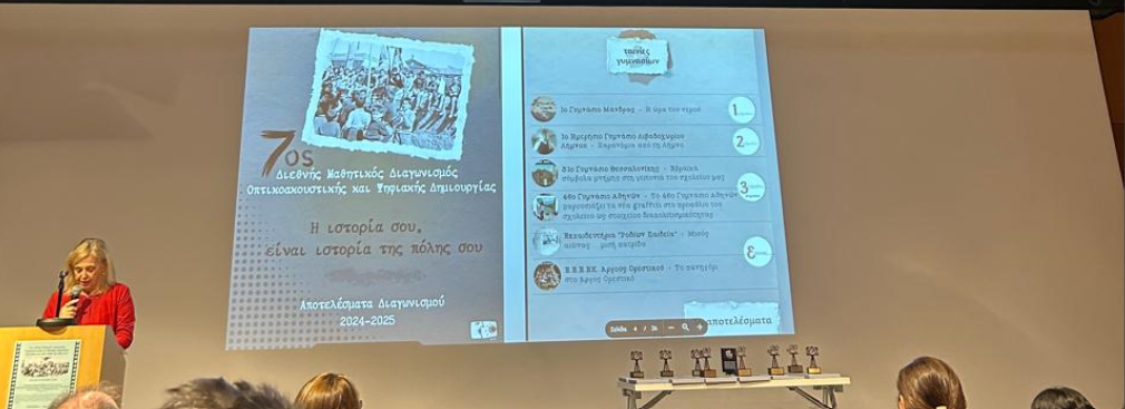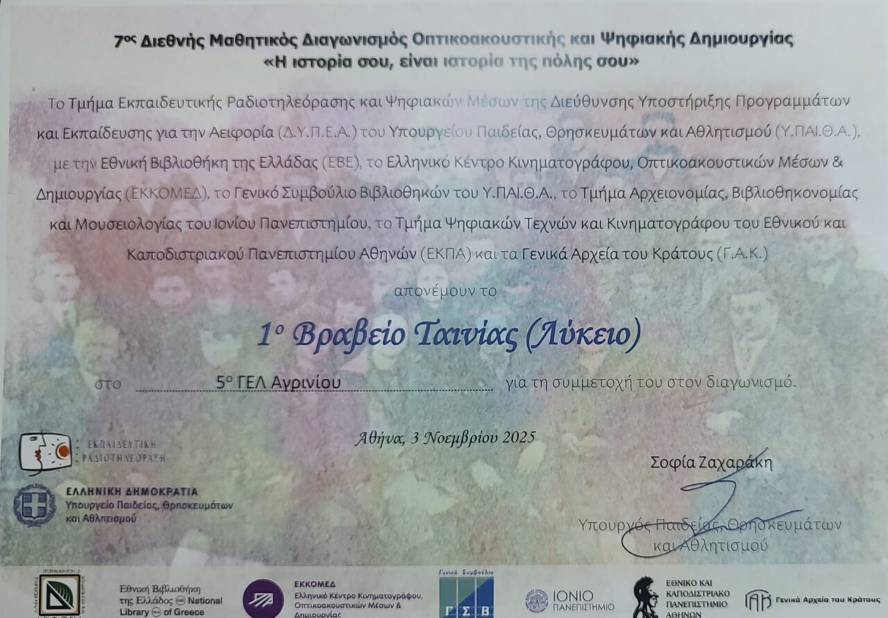 Το 5o ΓΕΛ Αγρινίου έλαβε το 1ο βραβείο στην κατηγορία λυκείων με το σύντομο ντοκιμαντέρ «ΤΟ ΠΑΡΚΟ ΜΑΣ…ΜΙΑ ΔΙΑΔΡΟΜΗ ΜΝΗΜΗΣ ΚΑΙ ΠΟΛΙΤΙΣΜΟΥ» στον 7ο Διεθνή Μαθητικό Διαγωνισμό: Η ιστορία σου, είναι ιστορία της πόλης σου 2024 – 2025 (https://blogs.sch.gr/dertv/2025/09/19/vraveia-7oy-diethnoys-mathitikoy-diagonismoy-i-istoria-soy-einai-istoria-tis-polis-soy-2024-2025/).