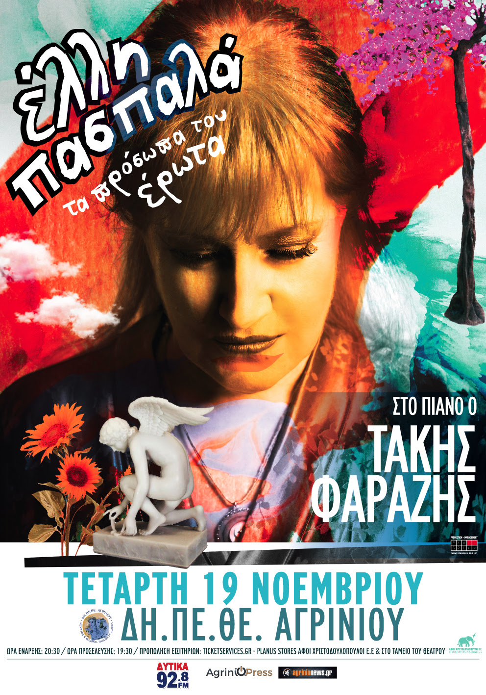 Την Τετάρτη 19 Νοεμβρίου η Έλλη Πασπαλά παρουσιάζει τη νέα της παράσταση «Τα Πρόσωπα του Έρωτα» στο ΔΗ.ΠΕ.ΘΕ Αγρινίου. Μαζί της στο πιάνο ο Τάκης Φαραζής