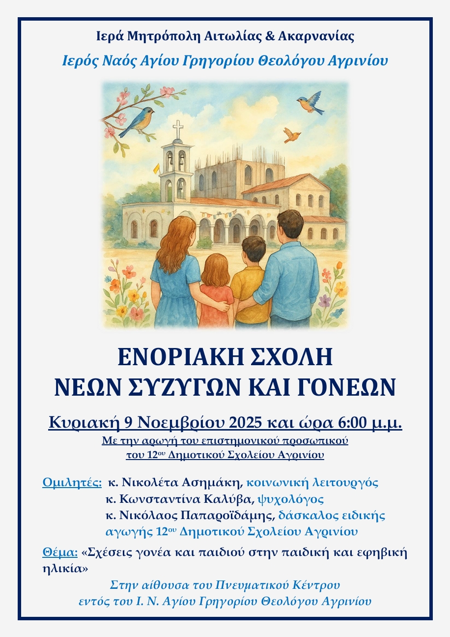 Αυτή την Κυριακή 9 Νοεμβρίου, θα πραγματοποιηθεί στο Αγρίνιο, η δεύτερη συνάντηση της Ενοριακής Σχολής Νέων Συζύγων και Γονέων του Ιερού Ναού Αγίου Γρηγορίου Θεολόγου.