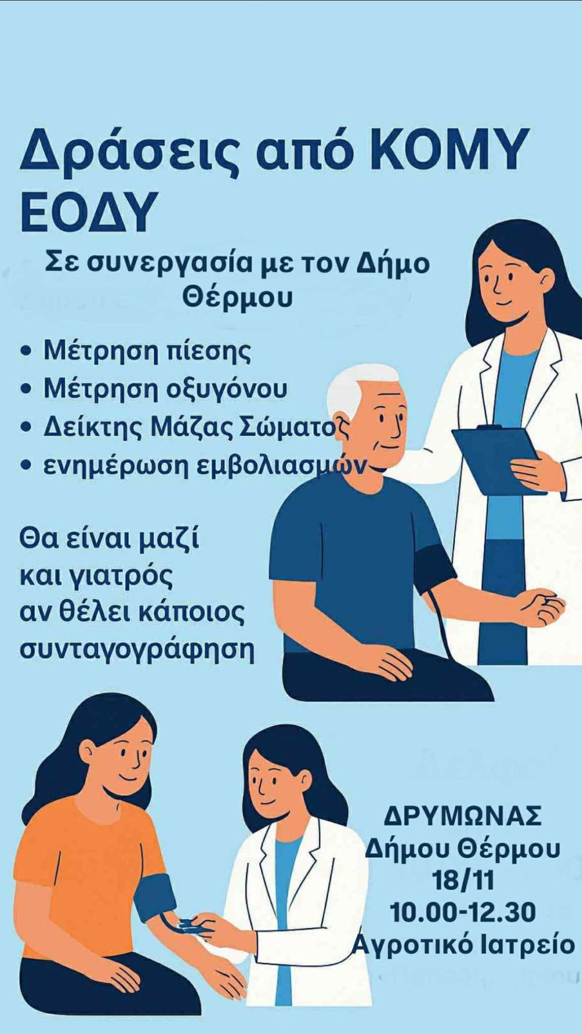 Αυτοδιοικητικές Αρχές, θα πραγματοποιήσουν σειρά προληπτικών εξετάσεων στο Δρυμώνα Θέρμου, στο Αγροτικό Ιατρείο, την Τρίτη 18 Νοεμβρίου, από 10:00 έως 12:30.