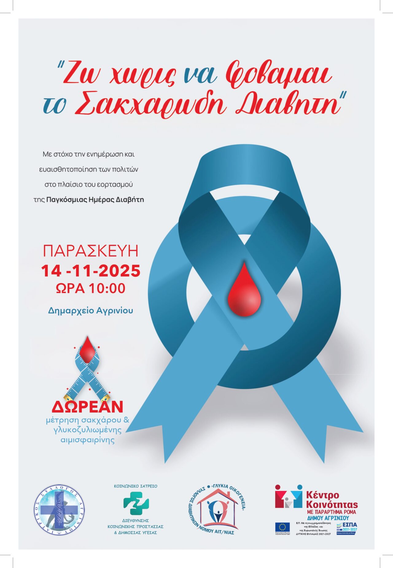 Ο Ιατρικός Σύλλογος Αγρινίου, σε συνεργασία με το νοσηλευτικό προσωπικό του Κοινωνικού Ιατρείου της Διεύθυνσης Κοινωνικής Προστασίας και Δημόσιας Υγείας του Δήμου Αγρινίου, τον Σύλλογο Διαβητικών Ν.Αιτωλ/νιας «Γλυκιά Οικογένεια» και το Κέντρο Κοινότητας του Δήμου Αγρινίου, με αφορμή την Παγκόσμια Ημέρα Διαβήτη, σας προσκαλεί να συμμετάσχετε στη δράση ενημέρωσης και ευαισθητοποίησης που θα πραγματοποιηθεί την Παρασκευή 14 Νοεμβρίου 2025, από 10:00 έως 12:00, μπροστά από το Δημαρχείο Αγρινίου.