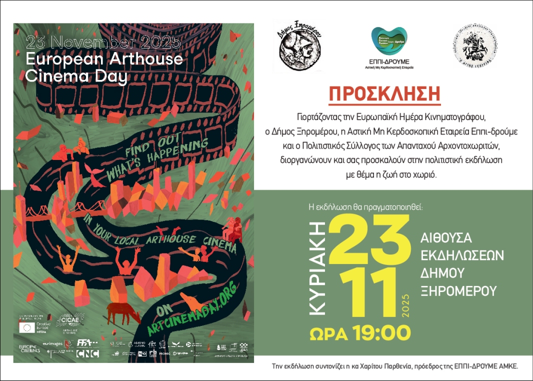 Ο Δήμος Ξηρομέρου, σε συνδιοργάνωση με την Αστική Μη Κερδοσκοπική Εταιρεία “ΕΠΠΙ-ΔΡΟΥΜΕ”, ανακοινώνουν με ιδιαίτερη χαρά τη συμμετοχή τους στην Ευρωπαϊκή Ημέρα Κινηματογράφου (European Arthouse Cinema Day), η οποία θα πραγματοποιηθεί την Κυριακή 23 Νοεμβρίου 2025. Η εκδήλωση θα λάβει χώρα στην Αίθουσα Εκδηλώσεων του Δήμου Ξηρομέρου, με ώρα έναρξης στις 19:00.