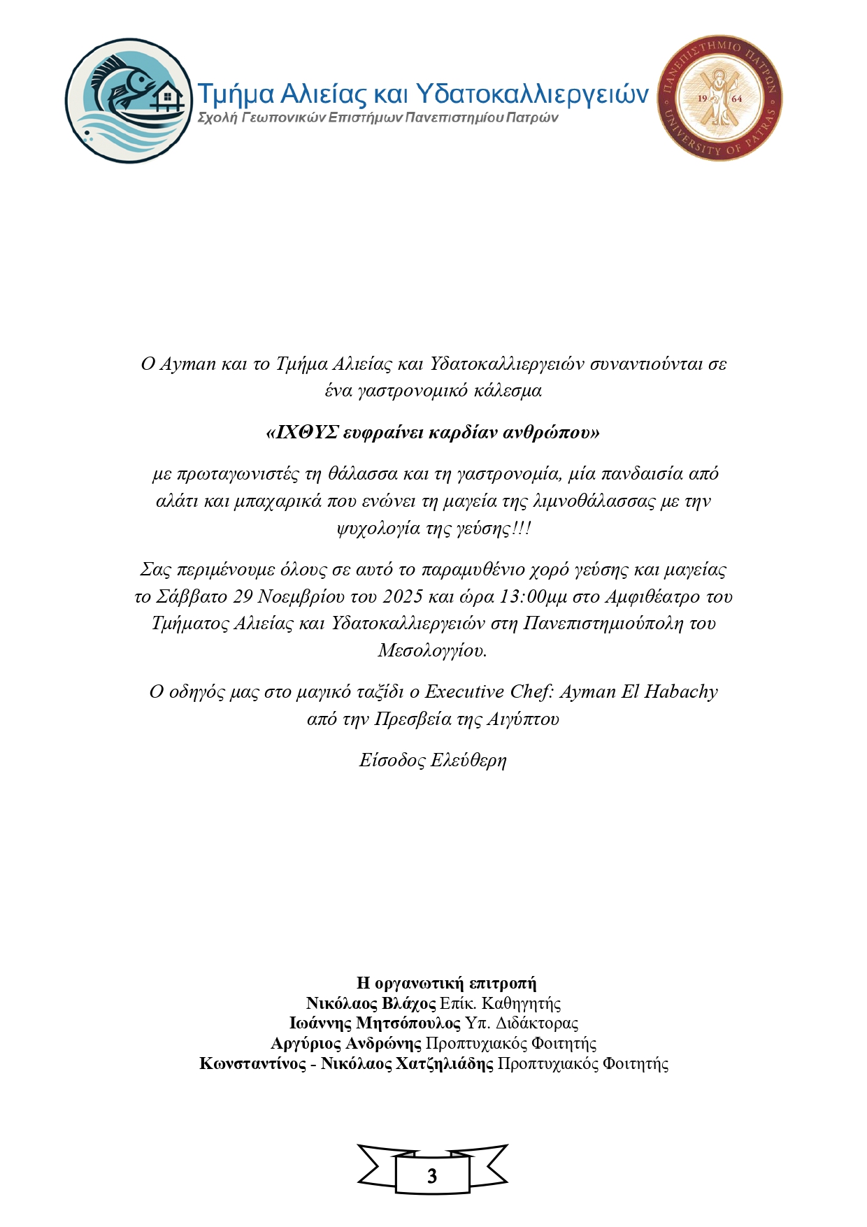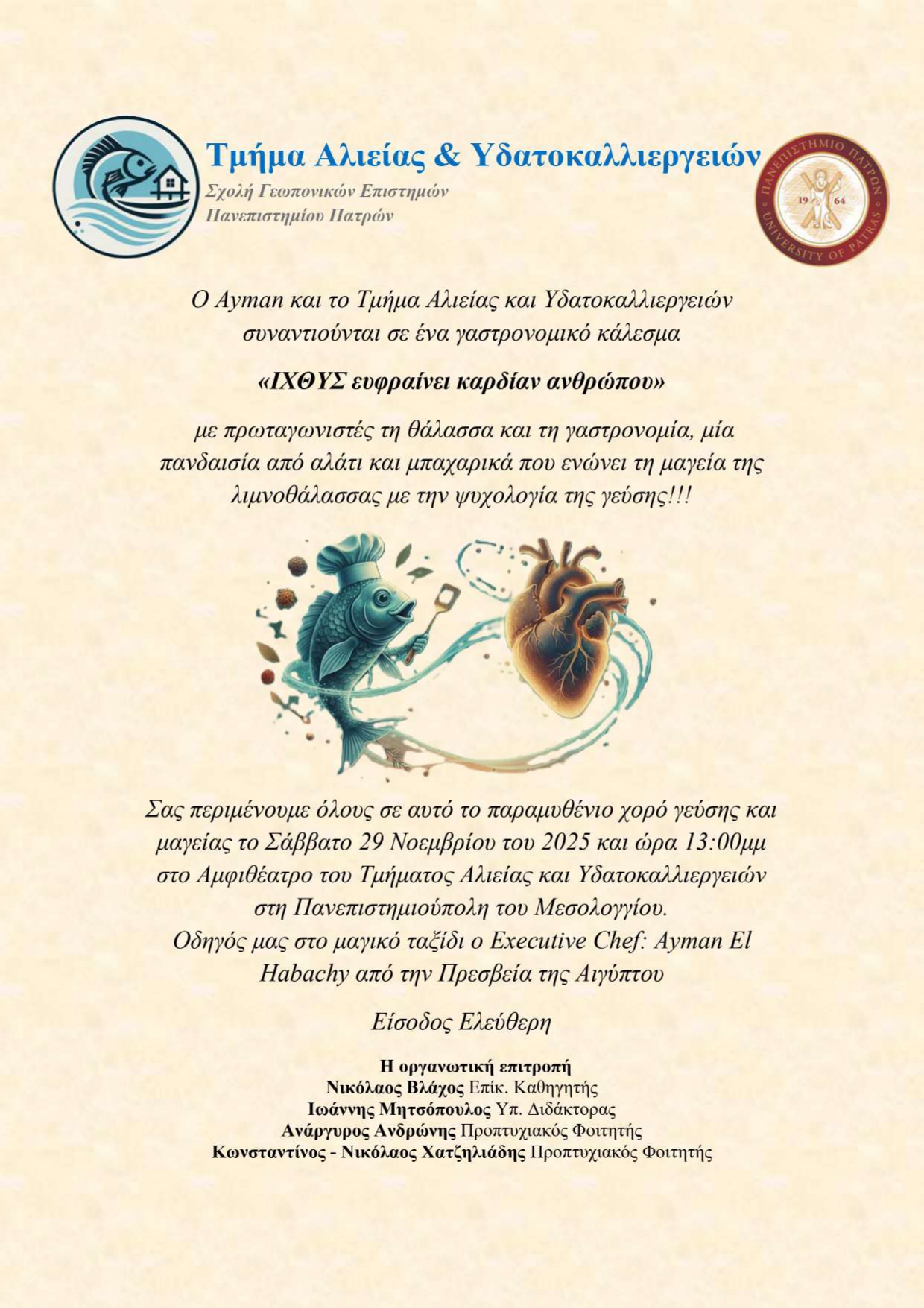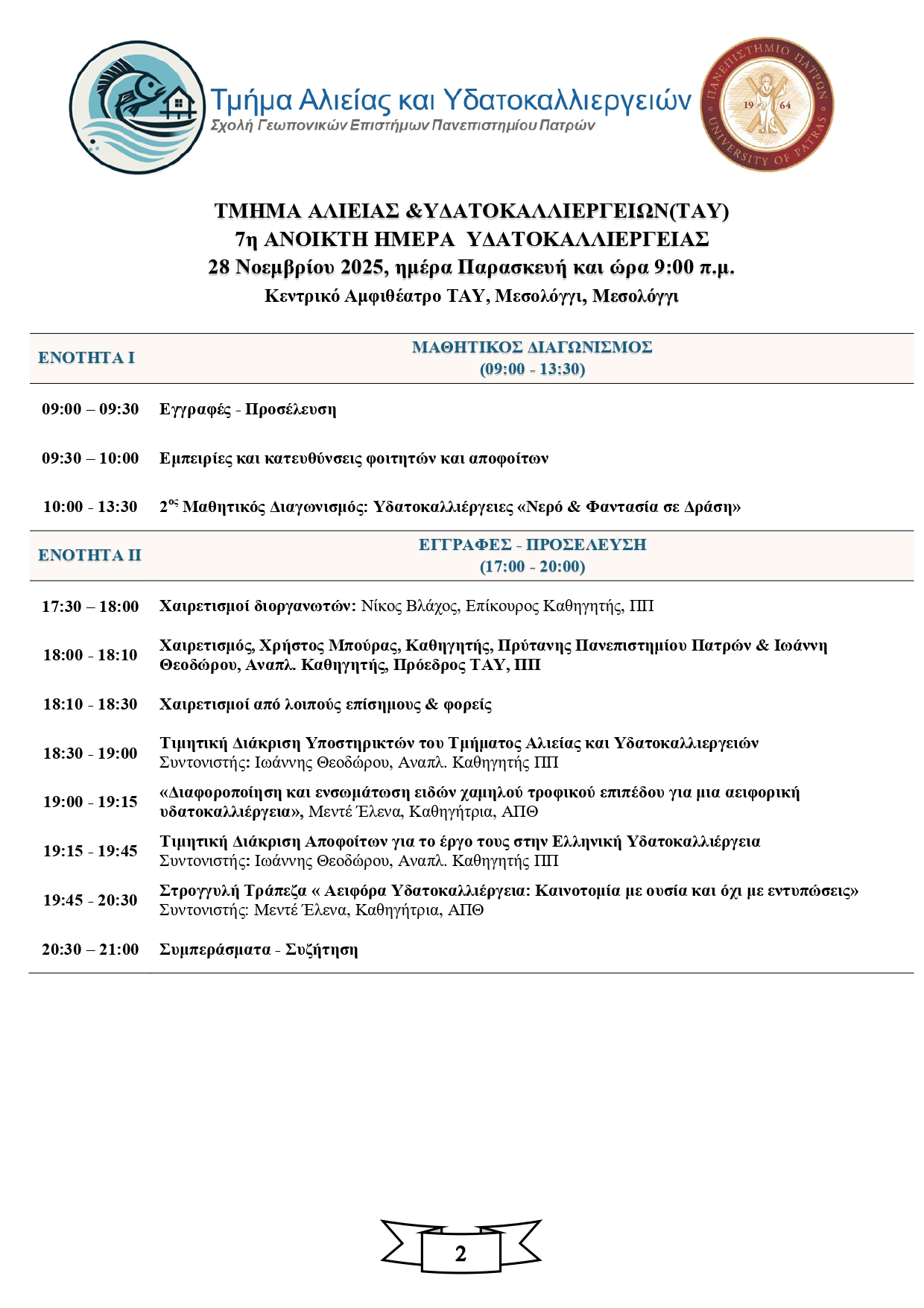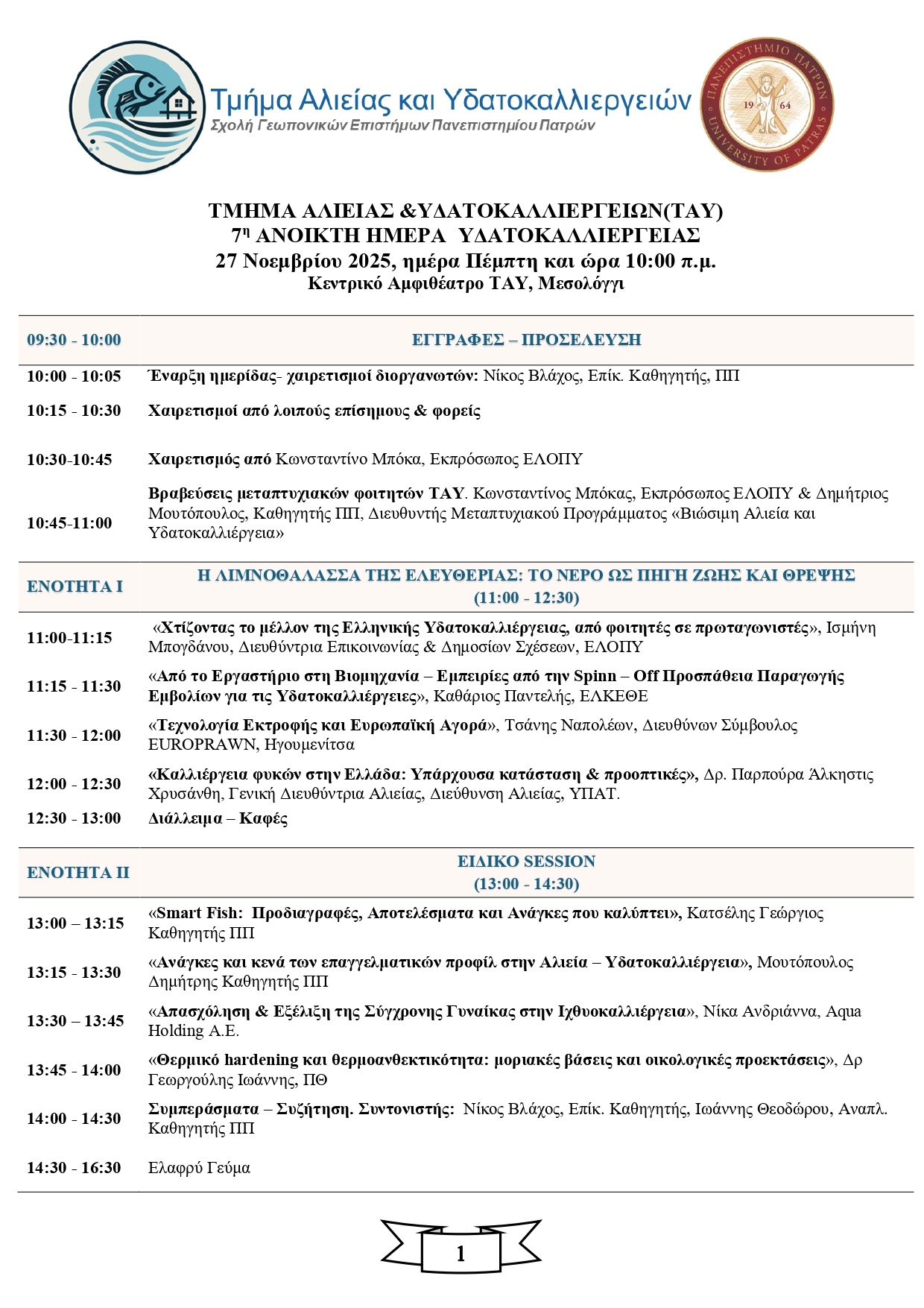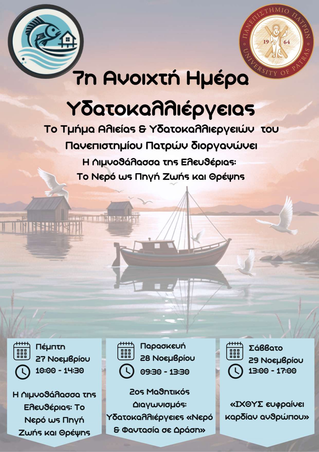 Την εκδήλωση διοργανώνει το τμήμα Αλιείας και Υδατοκαλλιεργειών του Πανεπιστημίου Πατρών στις εγκαταστάσεις του στο Μεσολόγγι (κεντρικό Αμφιθέατρο ΤΑΥ), στο πλαίσιο εορτασμού της 7ης ημέρας Υδατοκαλλιέργειας στις 27-29 Νοέμβριου 2025.