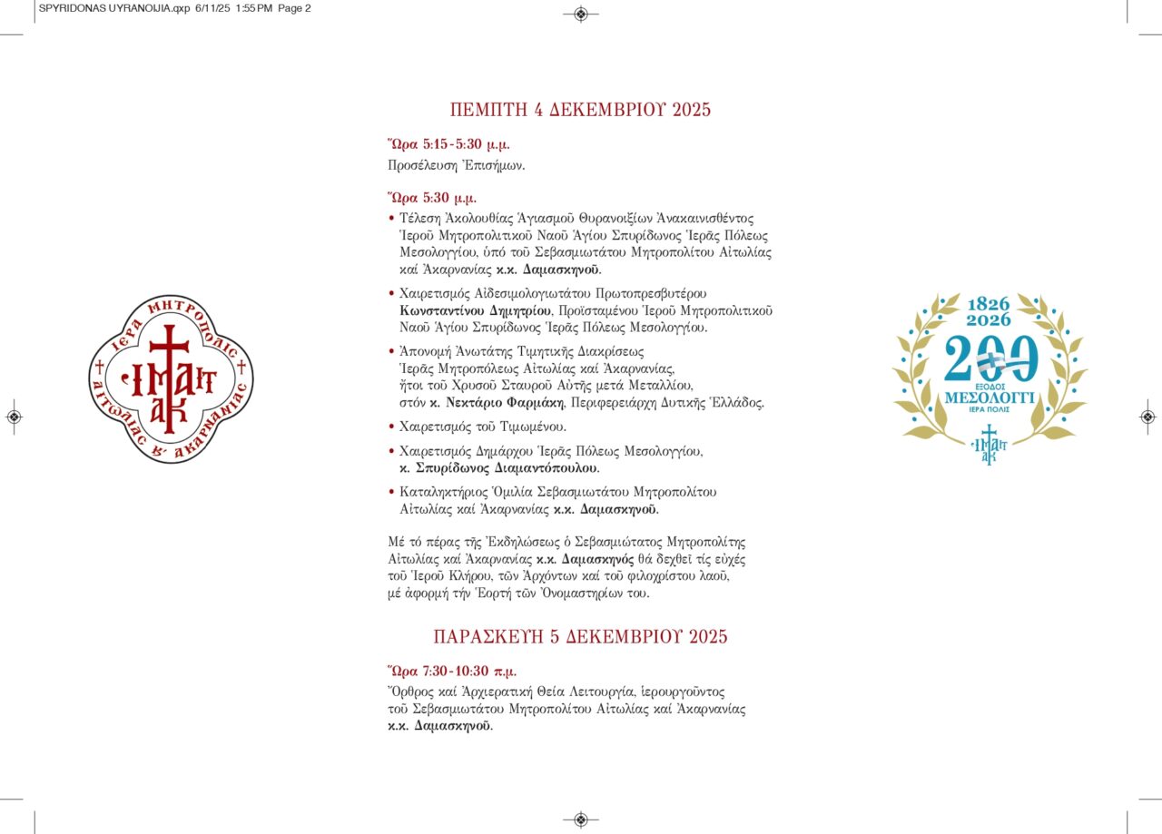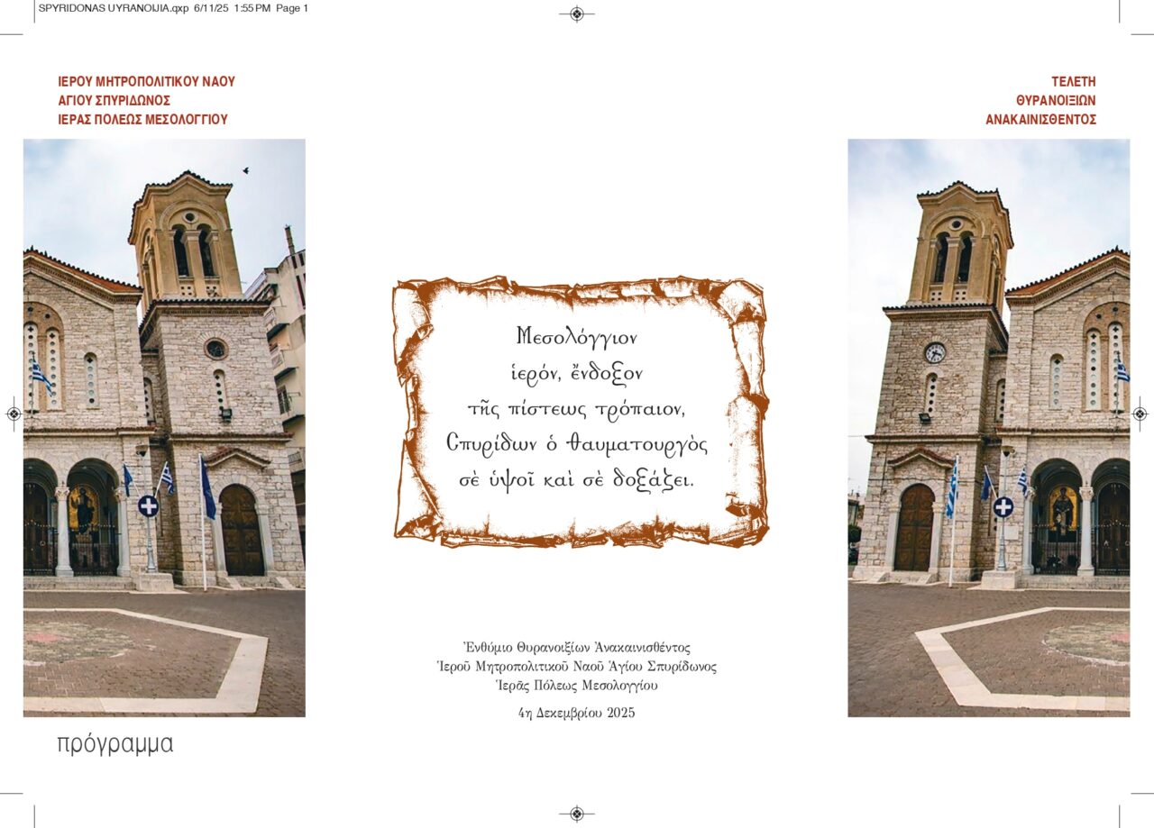 Τα θυρανοίξια του ανακαινισμένου Ιερού Μητροπολιτικού Ναού Αγίου Σπυρίδωνος θα τελεστούν στο Μεσολόγγι την Πέμπτη 4 Δεκεμβρίου 2025, όπως ανακοίνωσε η Μητρόπολη Αιτωλίας και Ακαρνανίας.
