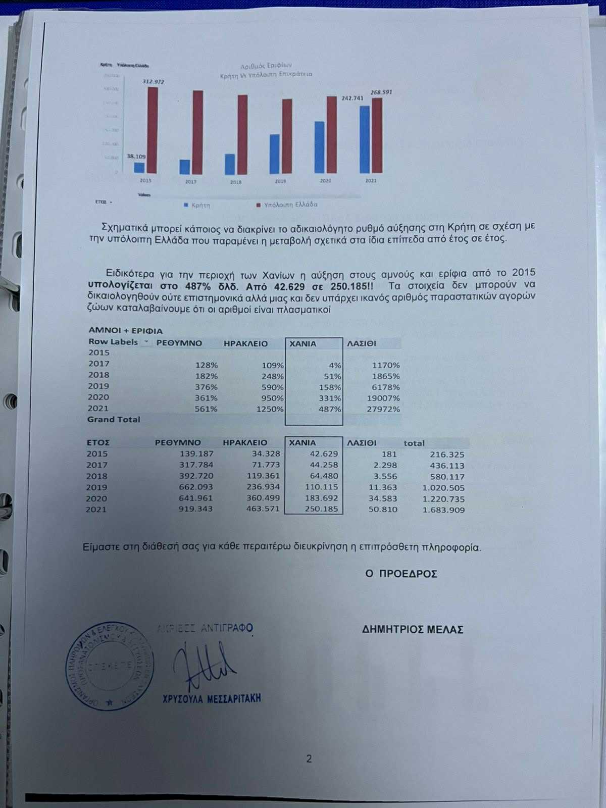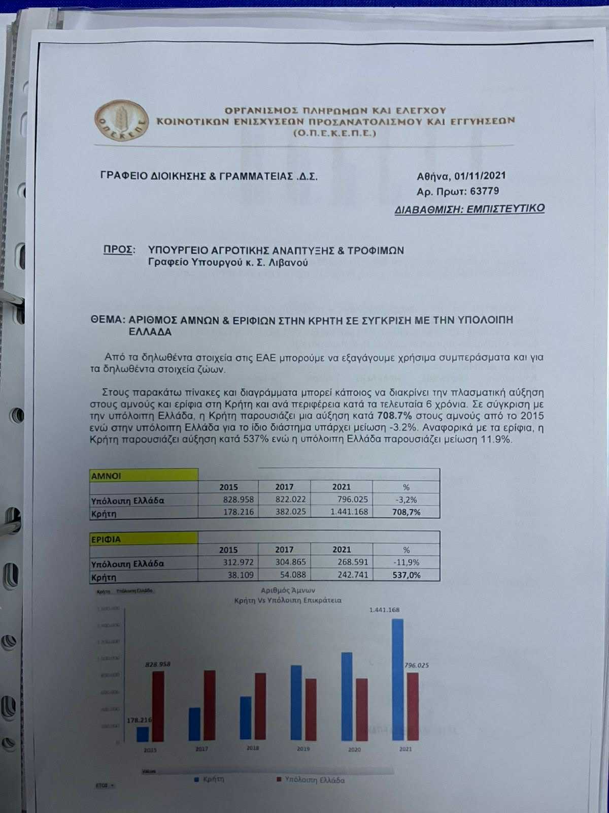 Ιδιαίτερο ενδιαφέρον παρουσίασαν και τα όσα ανέφερε ο κ. Λιβανός σχετικά με το θέμα της «τεχνικής λύσης» καθώς όπως είπε χαρακτηριστικά «ερχόμενος αντιμέτωπος με τους αριθμούς έμεινα εμβρόντητος, καθώς ήταν ηλίου φαεινότερο ότι υπήρχε μια ραγδαία και αφύσικη αύξηση του αριθμού των αμνοεριφίων σε συγκεκριμένες κτηνοτροφικές περιοχές της επικράτειας καθώς, επίσης, και μια τεράστια αύξηση στην κατανομή Εθνικού Αποθέματος» σημειώνοντας ότι στην Κρήτη εμφανιζόταν μια σωρευτική αύξηση των δηλώσεων κατά 708,7%.