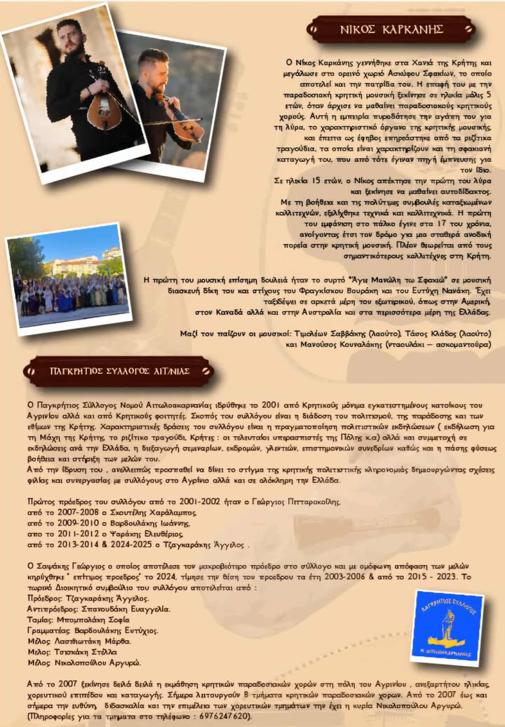 Ο Παγκρήτιος Σύλλογος Νομού Αιτωλοακαρνανίας διοργανώνει για ακόμη μια χρονιά το καθιερωμένο ετήσιο κρητικό γλέντι στο Αγρίνιο, το Σάββατο 29 Νοεμβρίου 2025, με τον Νίκος Καρκάνη.