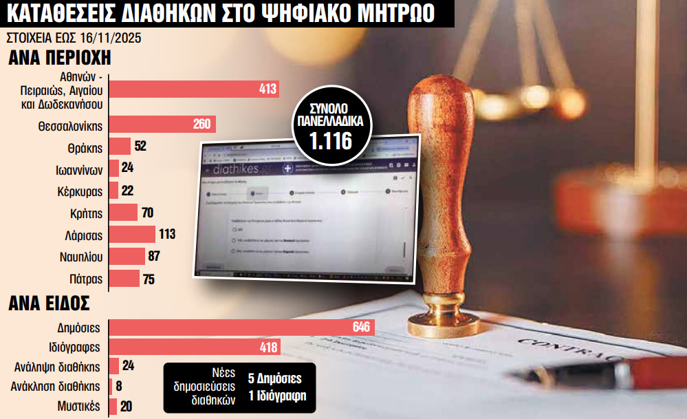Σύμφωνα με αυτά τα στοιχεία, μέχρι το μεσημέρι της περασμένης Παρασκευής, δηλαδή μέσα σε δέκα εργάσιμες ημέρες του Νοεμβρίου, 1.116 πολίτες σε όλη την Ελλάδα είχαν καταθέσει τις διαθήκες τους στο Μητρώο Διαθηκών. Γεγονός που από μόνο του αποτυπώνει, από τις πρώτες κιόλας ημέρες λειτουργίας της πλατφόρμας, ότι εκατοντάδες πολίτες που έχουν αποφασίσει πώς θα μοιράσουν την περιουσία τους επέλεξαν να επισκεφθούν ένα συμβολαιογραφικό γραφείο, τακτοποιώντας όσο είναι εν ζωή τα κληρονομικά τους θέματα.