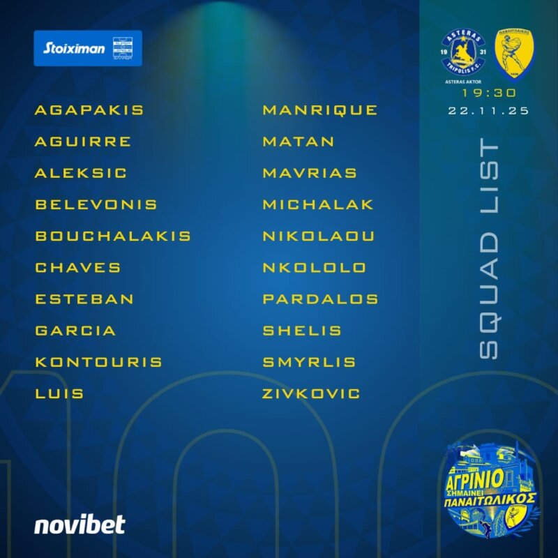 Στην αποστολή του αυριανού εκτός έδρας αγώνα με τον Αστέρα Aktor συμμετέχουν οι Ποδοσφαιριστές: