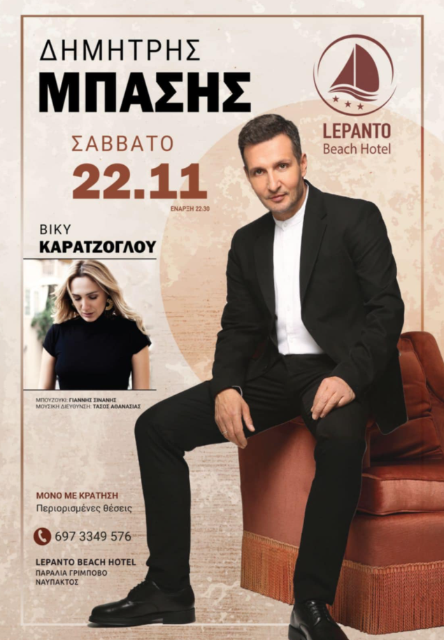 «Η Ναύπακτος είναι πάντα μια ιδιαίτερη στάση για μένα», ανέφερε ο Δημήτρης Μπάσης, ο οποίος επιστρέφει για μία ακόμα μουσική παράσταση, με μεγάλες επιτυχίες από την προσωπική του δισκογραφία, τραγούδια κορυφαίων δημιουργών, μοναδικές ερμηνείες, αληθινή ψυχαγωγία και νοσταλγία.