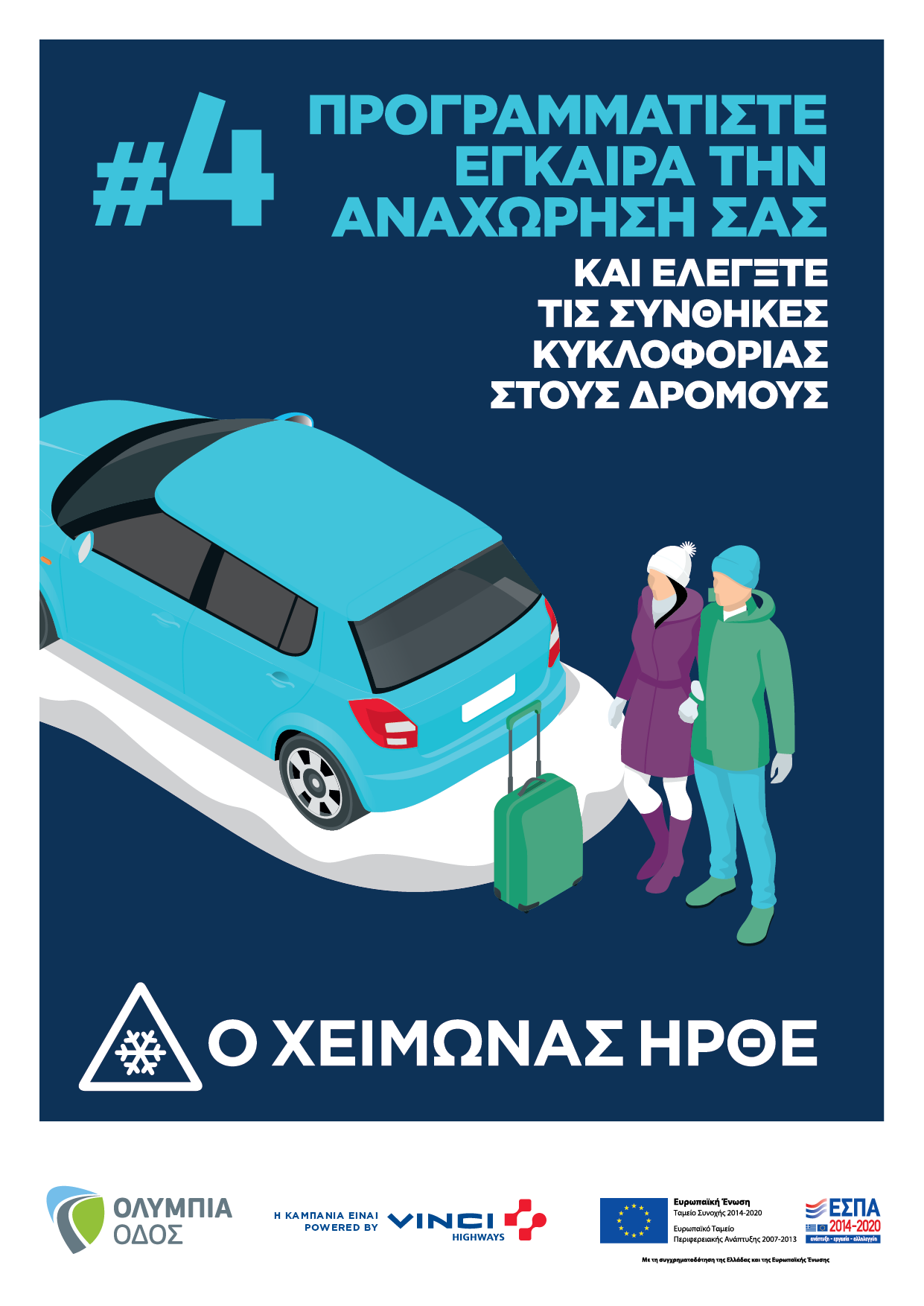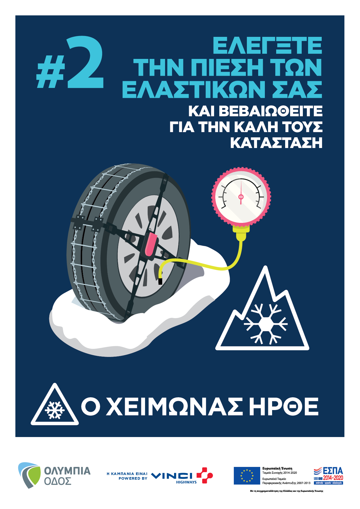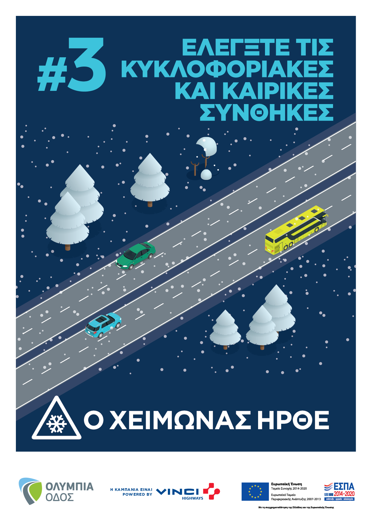 Ταυτόχρονα η Ολυμπία Οδός προωθεί την εκστρατεία ενημέρωσης των οδηγών με συμβουλές για την χειμερινή οδήγηση. Την περίοδο αυτή απαιτείται πρόσθετη κινητοποίηση ασφάλειας καθώς οι βλάβες στους κινητήρες είναι συχνότερες, τα υγρά των οχημάτων μπορεί να παγώσουν, ενώ τα ελαστικά των οχημάτων δεν προσαρμόζονται τόσο εύκολα στην οδήγηση. Για την εξυπηρέτηση των οδηγών σε τέτοιες περιπτώσεις, οι ομάδες μας βρίσκονται σε ετοιμότητα για να παρέμβουν άμεσα.