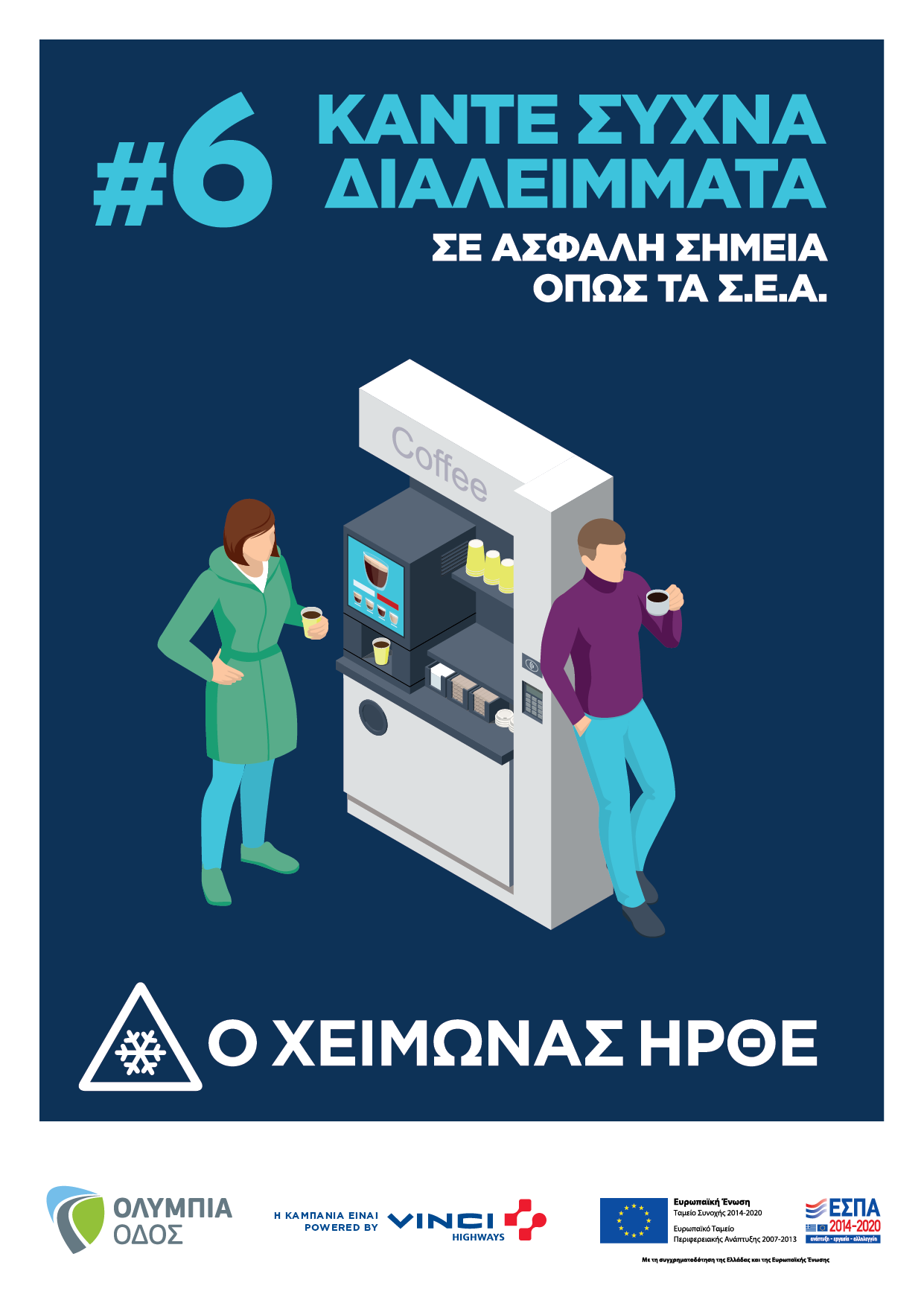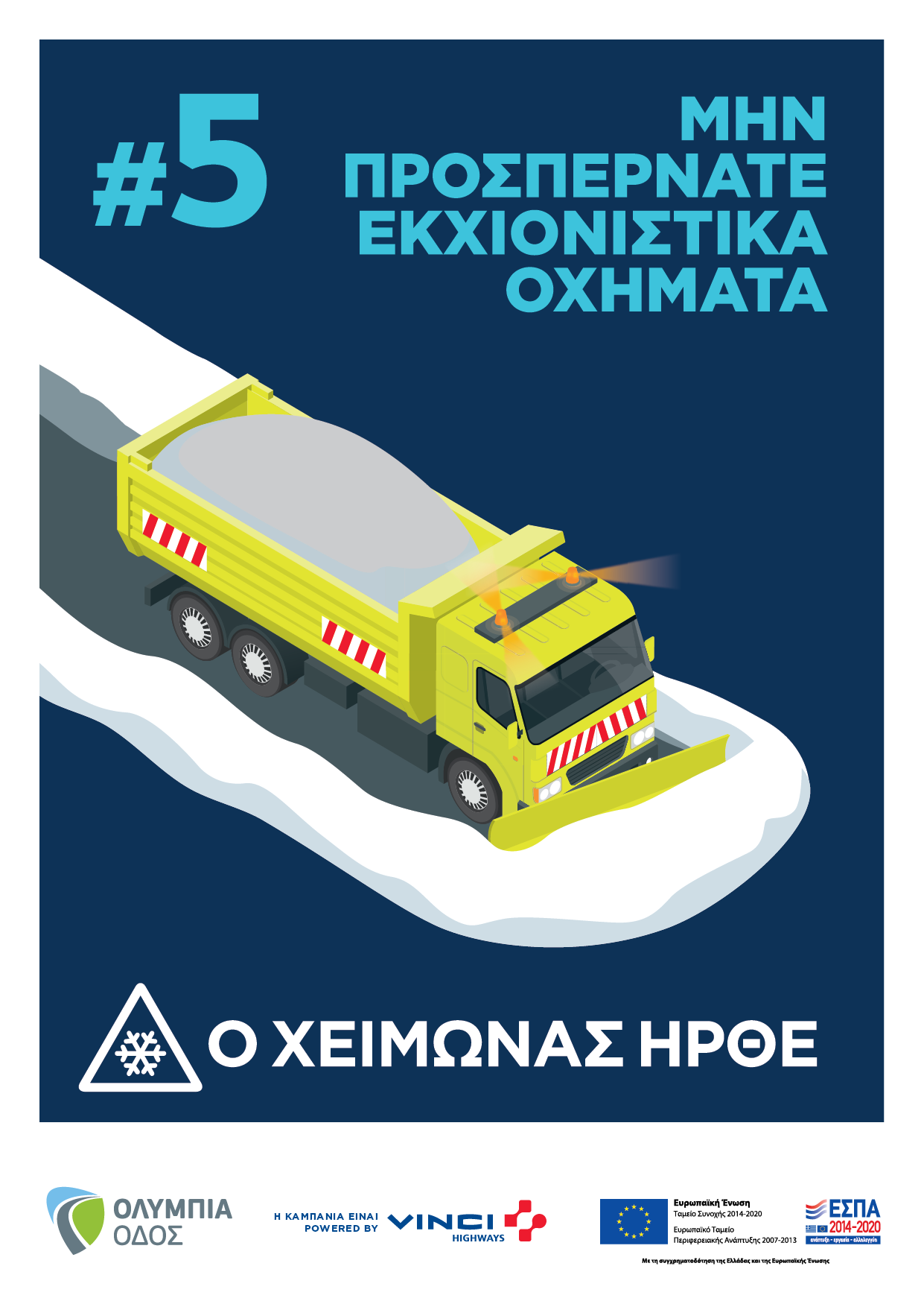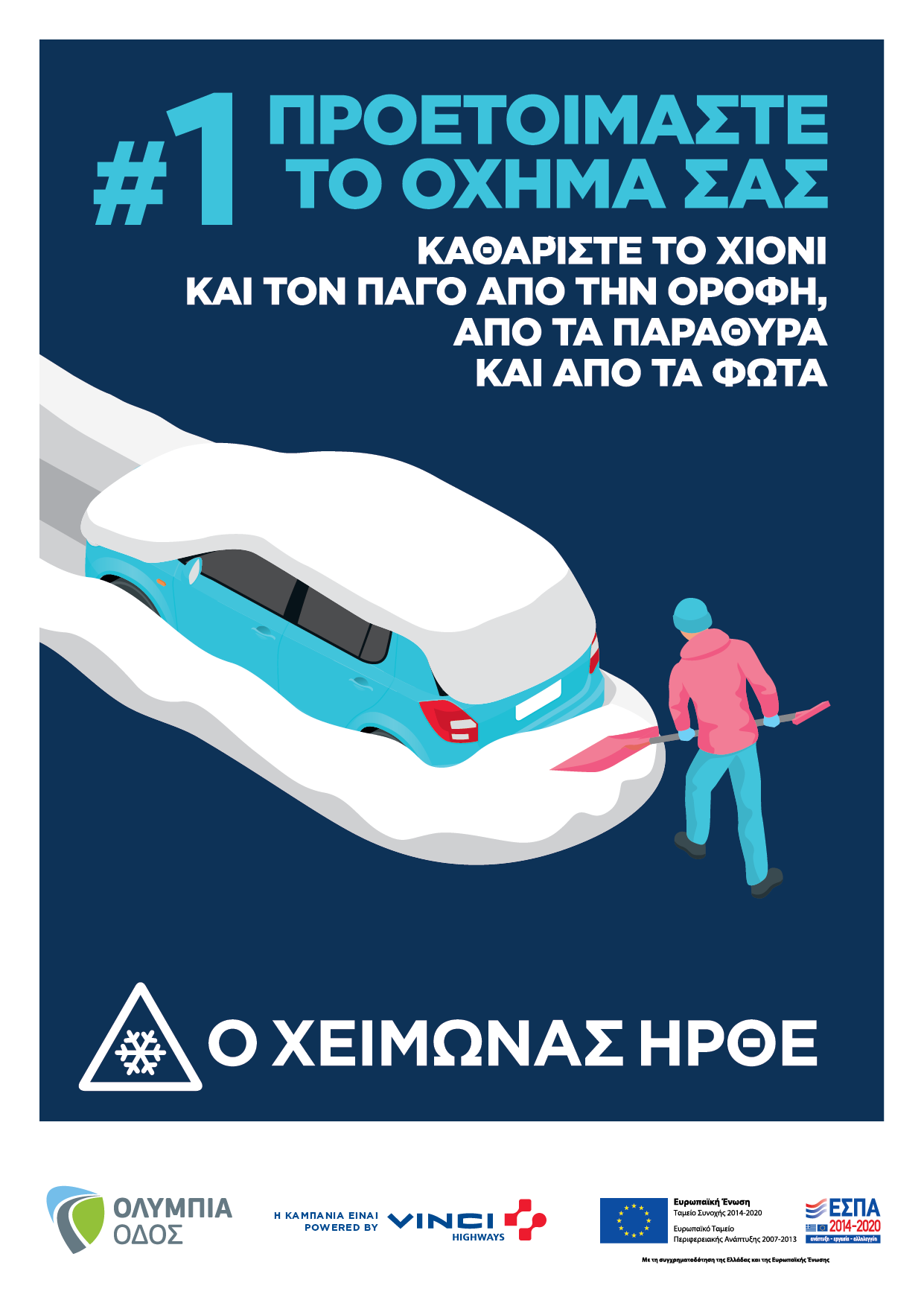 Ταυτόχρονα η Ολυμπία Οδός προωθεί την εκστρατεία ενημέρωσης των οδηγών με συμβουλές για την χειμερινή οδήγηση. Την περίοδο αυτή απαιτείται πρόσθετη κινητοποίηση ασφάλειας καθώς οι βλάβες στους κινητήρες είναι συχνότερες, τα υγρά των οχημάτων μπορεί να παγώσουν, ενώ τα ελαστικά των οχημάτων δεν προσαρμόζονται τόσο εύκολα στην οδήγηση. Για την εξυπηρέτηση των οδηγών σε τέτοιες περιπτώσεις, οι ομάδες μας βρίσκονται σε ετοιμότητα για να παρέμβουν άμεσα.