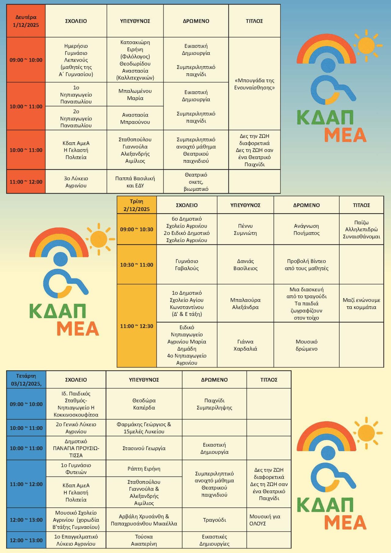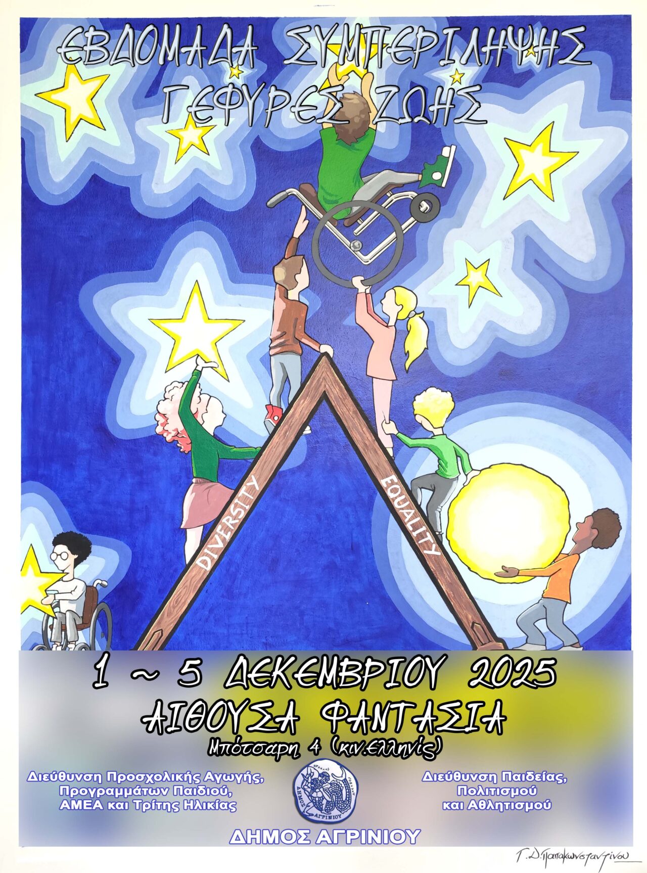 Ο Δήμος Αγρινίου, μέσω της Διεύθυνσης Προσχολικής Αγωγής, Προγραμμάτων Παιδιού, ΑμεΑ και Τρίτης Ηλικίας, σε συνεργασία με τη Διεύθυνση Παιδείας, Πολιτισμού και Αθλητισμού, διοργανώνει από την 1η έως και την 5η Δεκεμβρίου την «Εβδομάδα Συμπερίληψης», μια δράση αφιερωμένη στην προώθηση της ισότητας, του σεβασμού, της αποδοχής και της ουσιαστικής ένταξης κάθε παιδιού, ανεξαρτήτως ικανοτήτων.