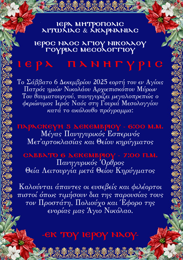 Το Σάββατο 6 Δεκεμβρίου 2025, εορτή του εν Αγίοις Πατρός ημών Νικολάου Αρχιεπισκόπου Μύρων του θαυματουργού, πανηγυρίζει μεγαλοπρεπώς ο φερώνυμος Ιερός Ναός στη Γουριά Μεσολογγίου κατά το ακόλουθο πρόγραμμα: