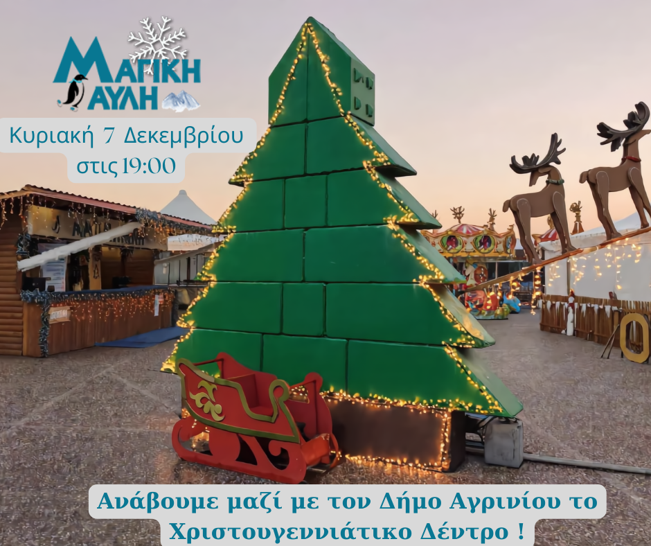 Σας περιμένουμε όλους στην πλατεία Αγρινίου, την Κυριακή 7 Δεκεμβρίου, στις 19:00, για να ανάψουμε μαζί το Χριστουγεννιάτικο Δέντρο – και στη Μαγική Αυλή αμέσως μετά, για να ανοίξουμε την πόρτα σε έναν μαγικό, γιορτινό κόσμο!