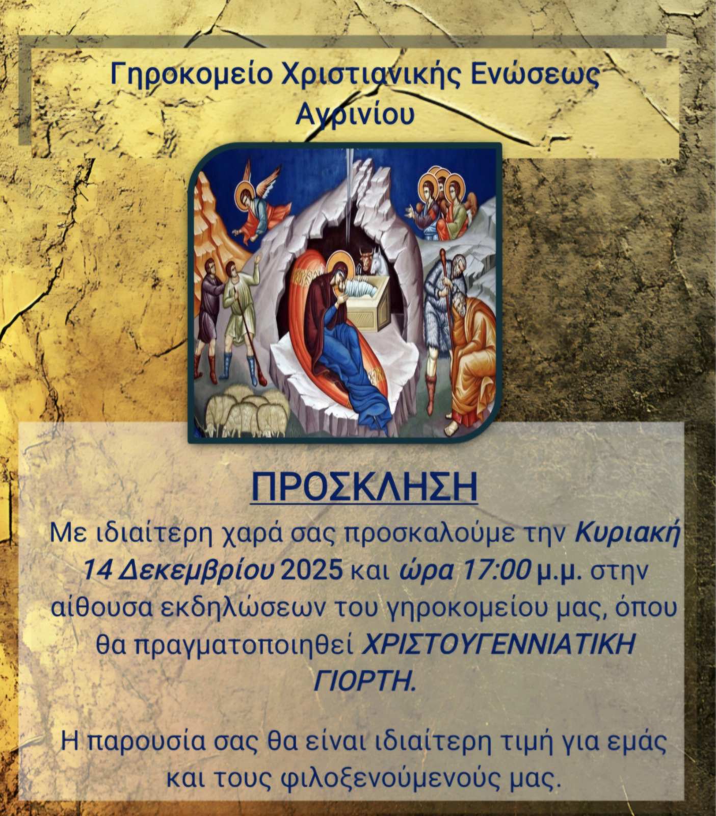 Χριστουγεννιάτικη γιορτή θα πραγματοποιηθεί στο γηροκομείο της Χριστιανικής Ένωσης Αγρινίου την ερχόμενη Κυριακή, στις 14 Δεκεμβρίου 2025.