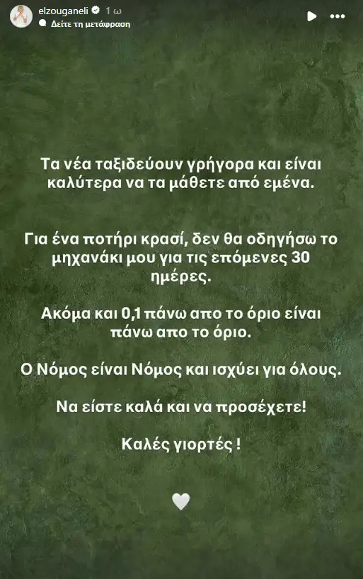 Την πρώτη της ανάρτηση έκανε η Ελεωνόρα Ζουγανέλη, μετά το πρόστιμο που έλαβε από την τροχαία, επειδή οδηγούσε το μηχανάκι της υπό την επήρεια αλκοόλ και ανέφερε στους ακολούθους της στο Instagram ότι ο νόμος είναι ίδιος για όλους.