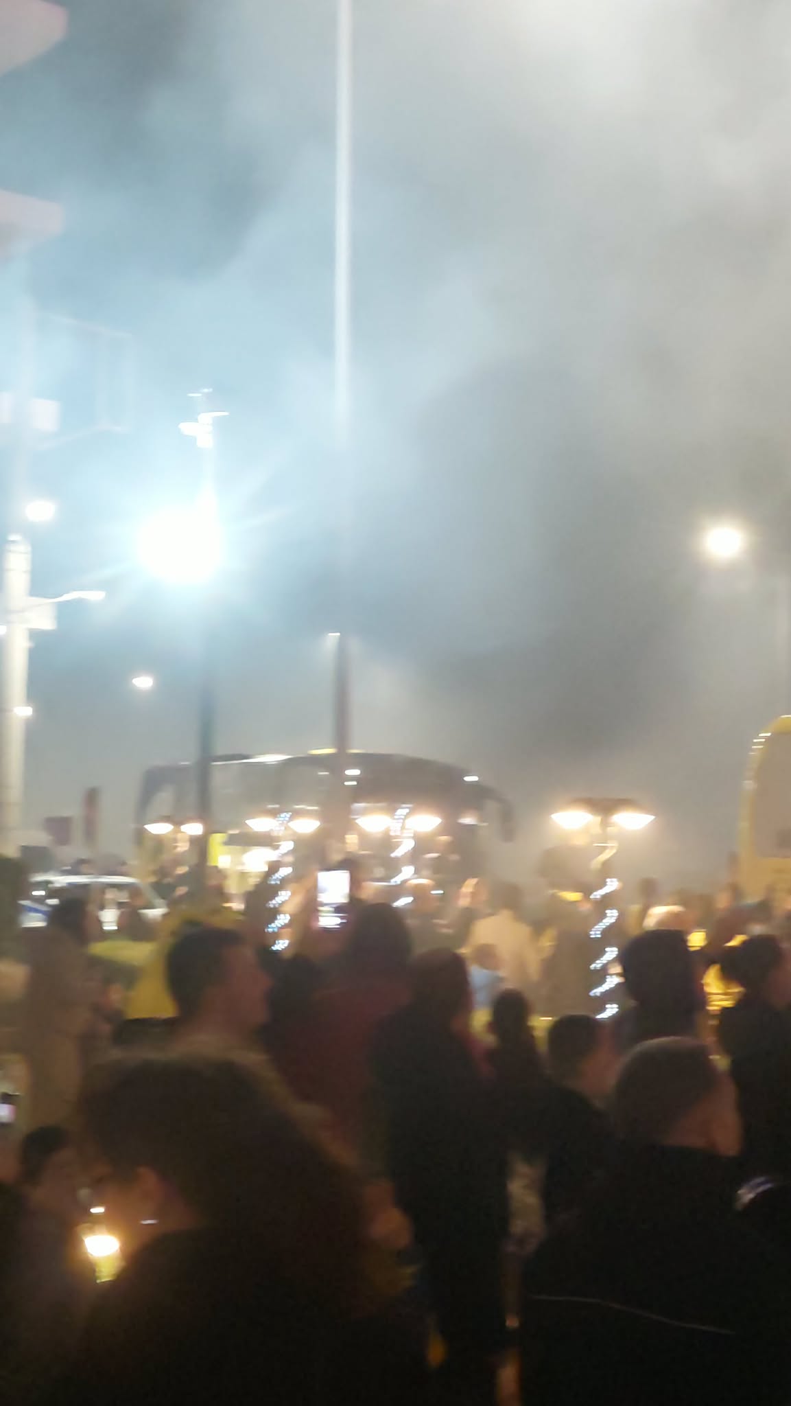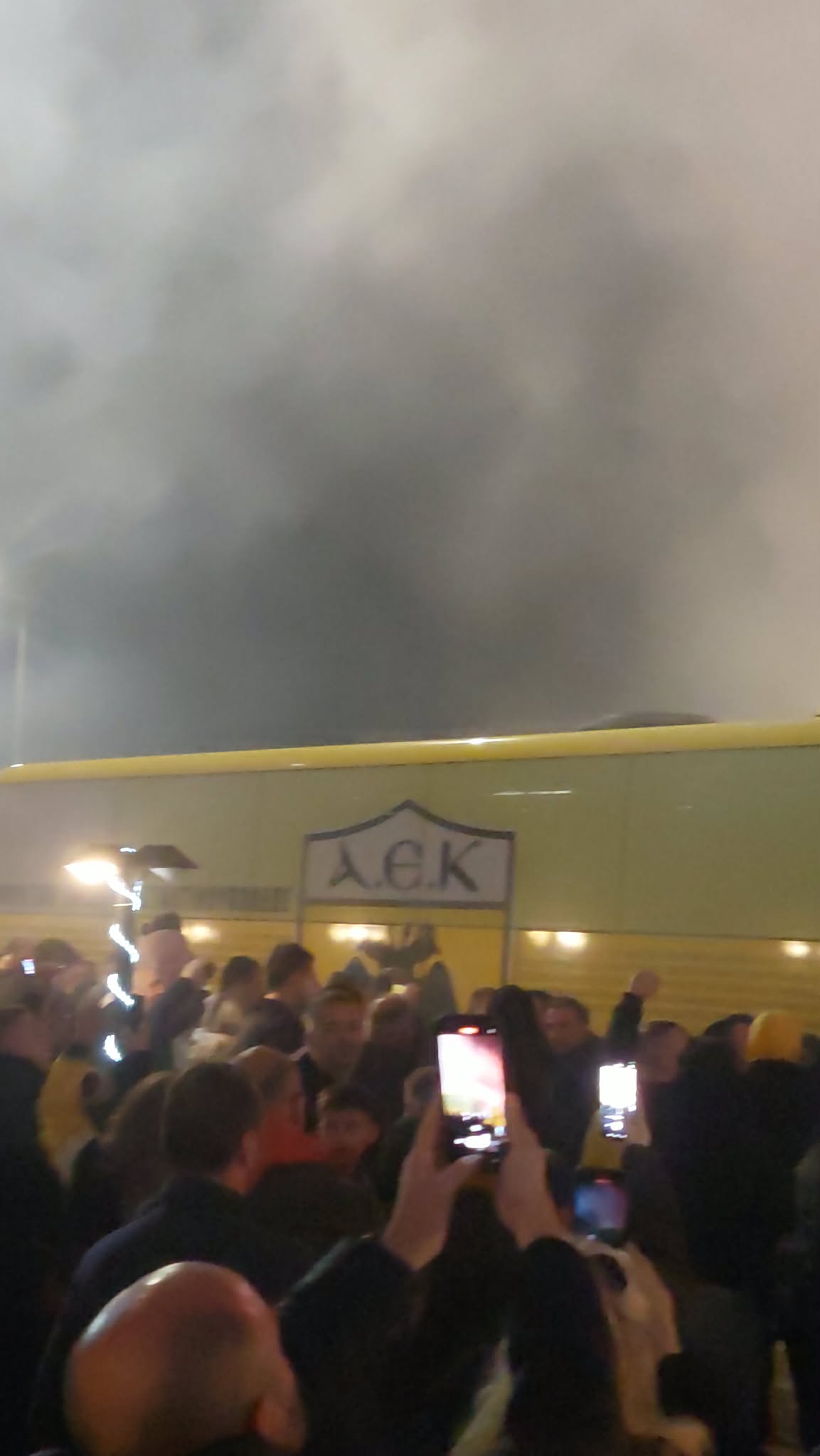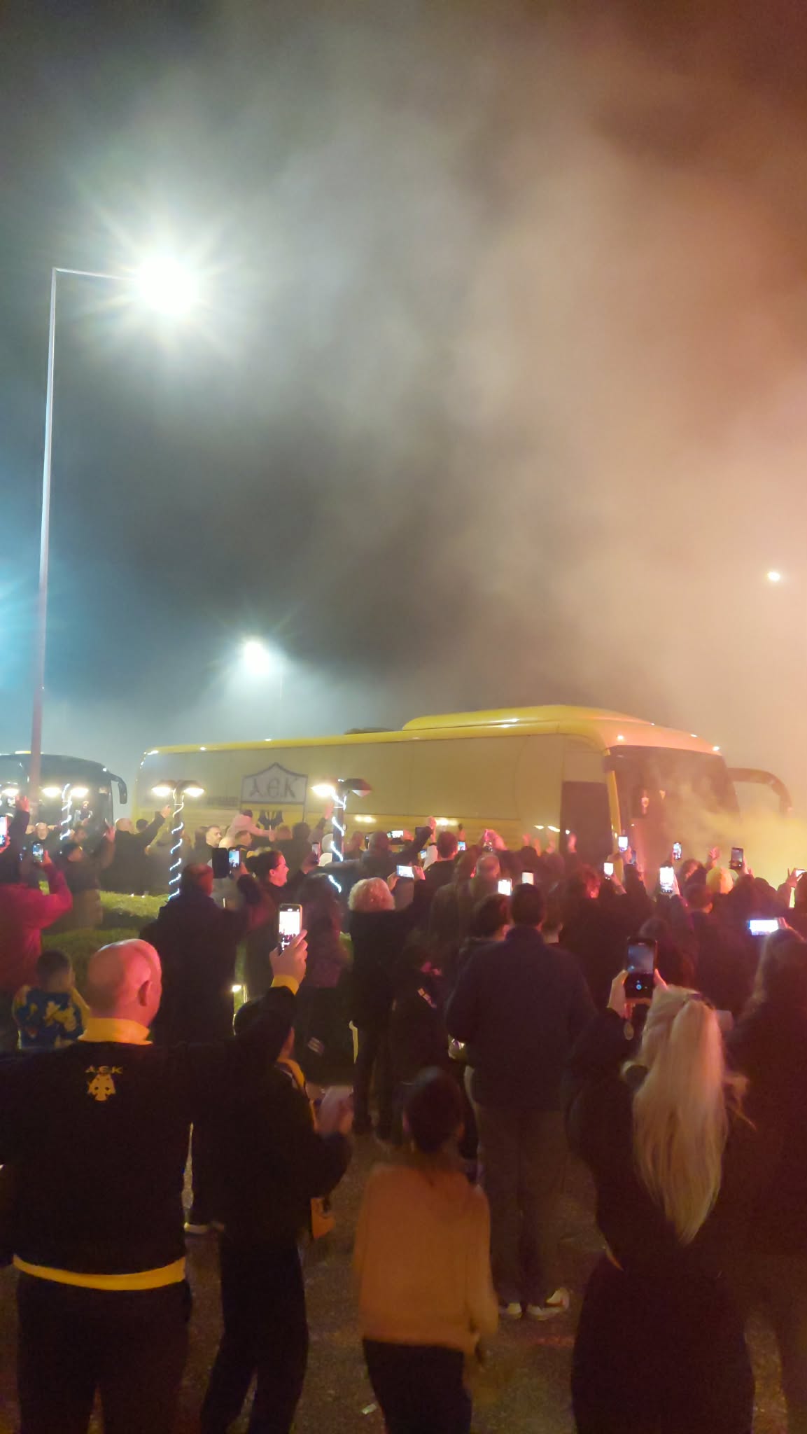Φωνάζοντας συνθήματα και ρίχνοντας πυροτεχνήματα έκαναν τη νύχτα μέρα όταν το λεωφορείο πλησίαζε στο ξενοδοχείο με μικρούς και μεγάλους να εμψυχώνουν την ομάδα για το αυριανό παιχνίδι.