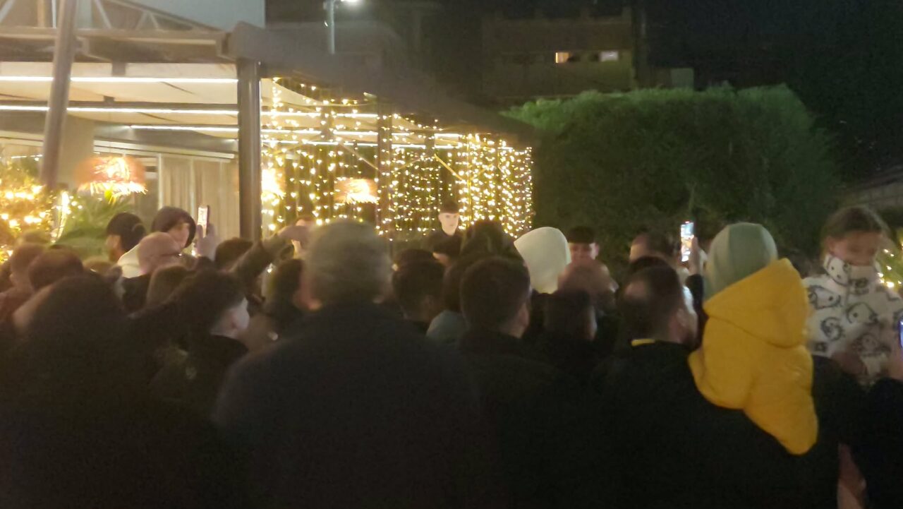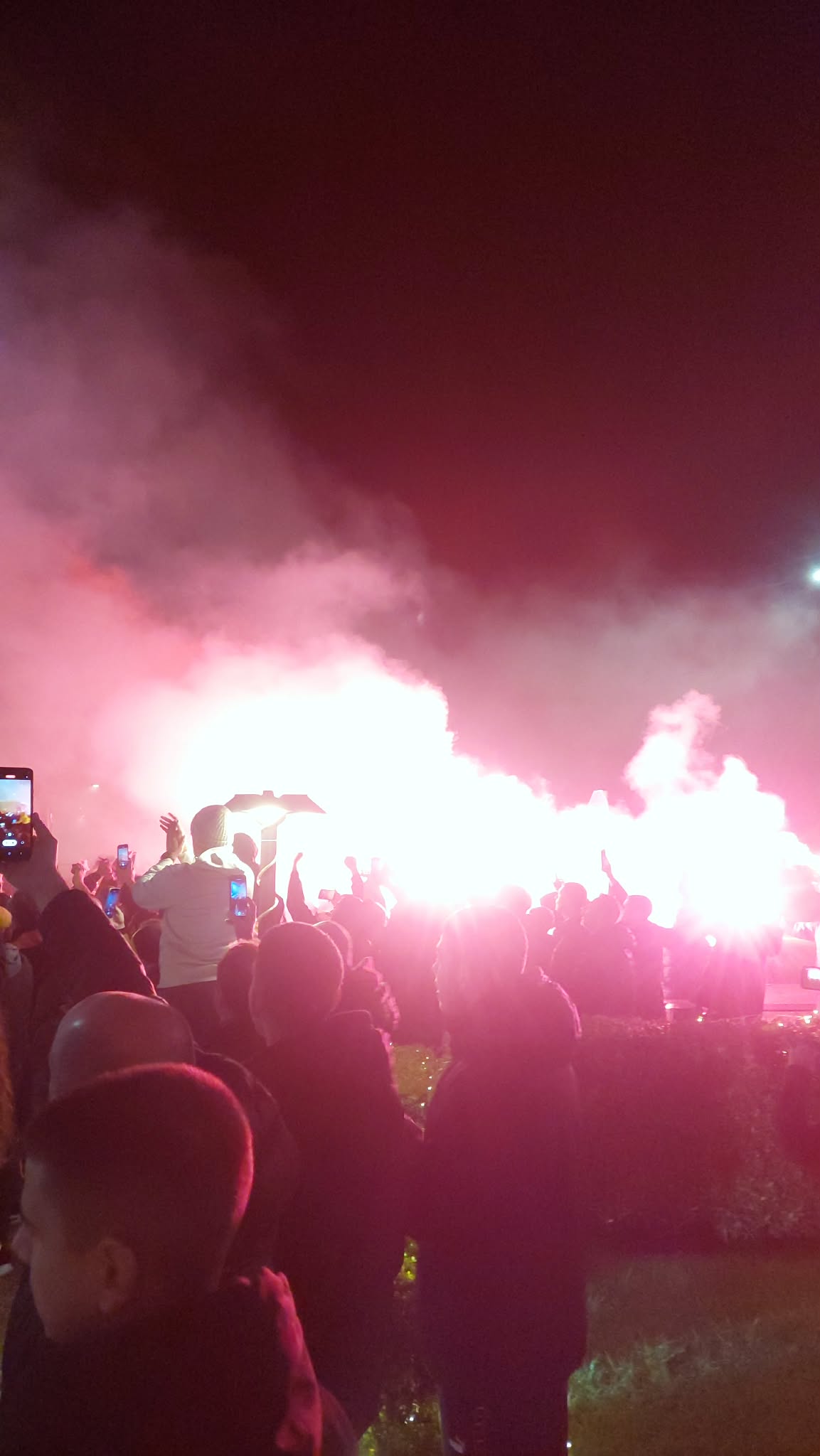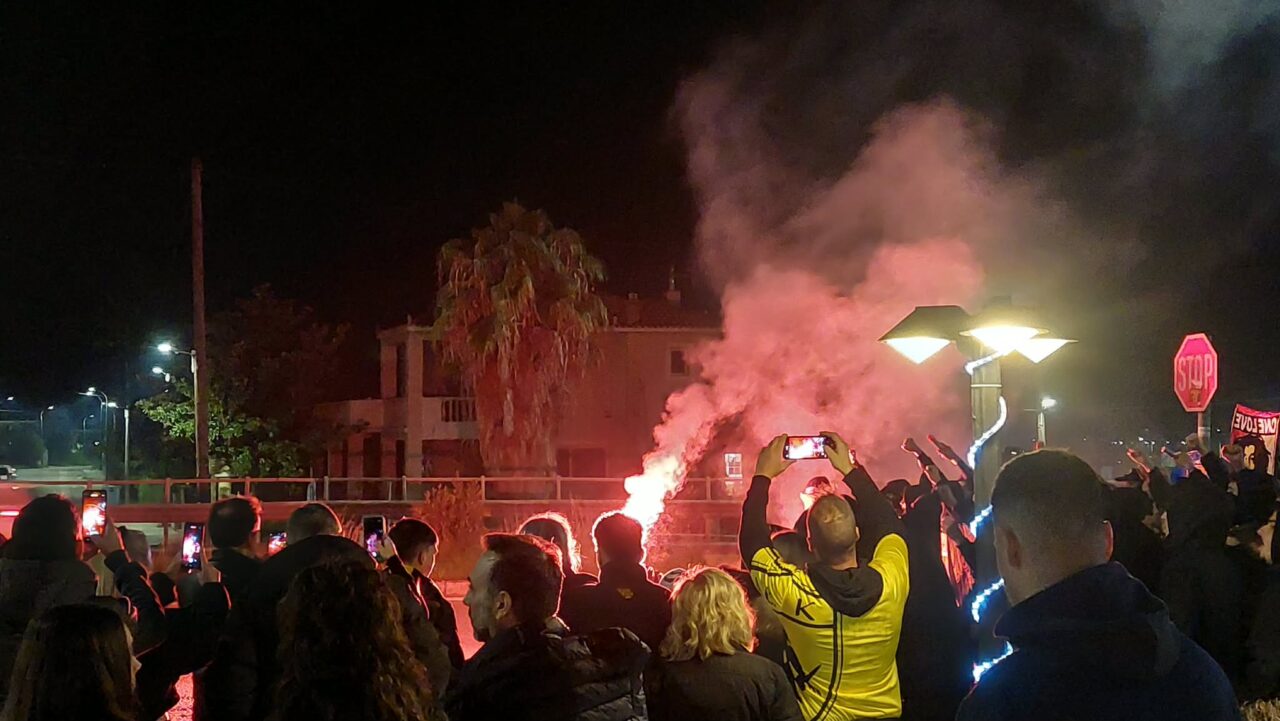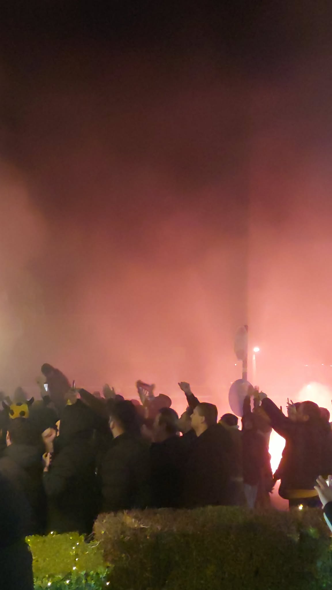 Φωνάζοντας συνθήματα και ρίχνοντας πυροτεχνήματα έκαναν τη νύχτα μέρα όταν το λεωφορείο πλησίαζε στο ξενοδοχείο με μικρούς και μεγάλους να εμψυχώνουν την ομάδα για το αυριανό παιχνίδι.