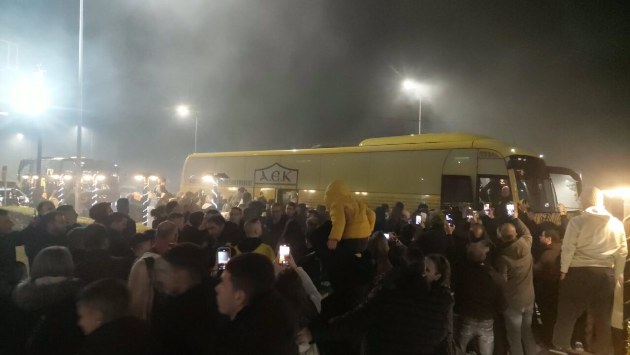 Οι οπαδοί της ΑΕΚ βρέθηκαν από νωρίς στον εξωτερικό χώρο του ξενοδοχείου στην εθνική οδό περιμένοντας να δουν από κοντά τους αγαπημένους τους παίκτες.