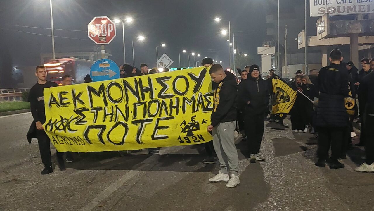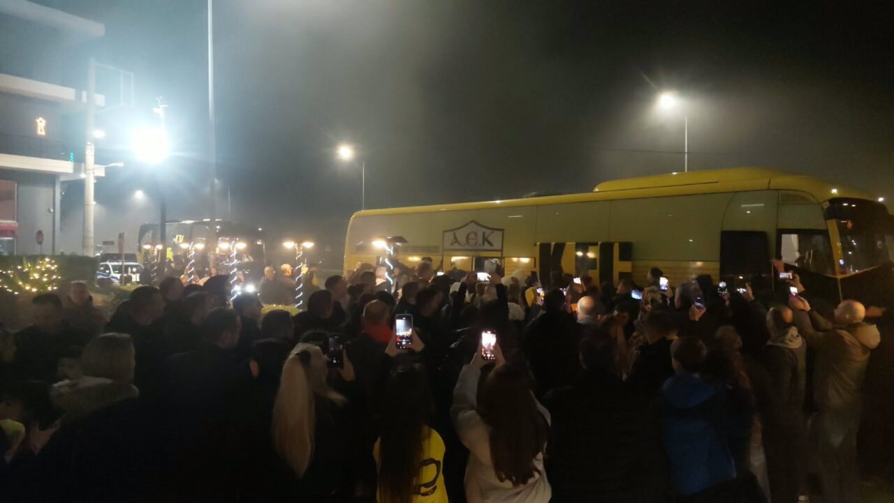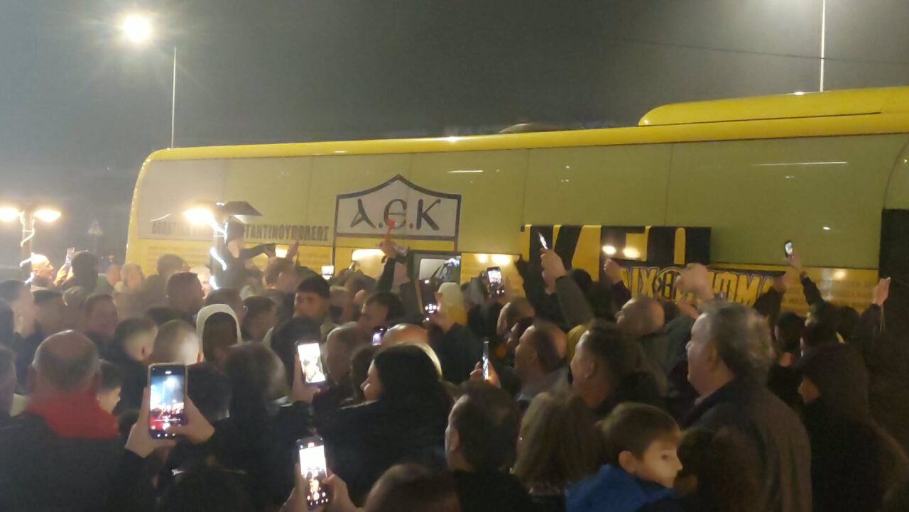 Λίγο πριν τις 9 το βράδυ του Σαββάτου οι Αγρινιώτες οπαδοί υποδέχτηκαν την ΑΕΚ, στο Αγρίνιο, στο ξενοδοχείο όπου η ομάδα θα διανυκτερεύσει για τον αυριανό αγώνα με τον Παναιτωλικό.