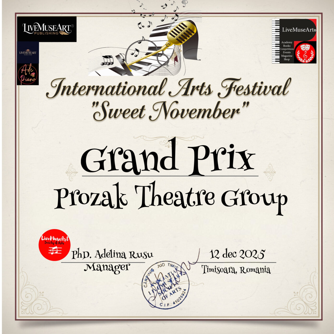 Σημαντική διεθνή διάκριση απέσπασε η Θεατρική Ομάδα ΠΡΟΖΑΚ, κατακτώντας το Grand Prix στο στο Διεθνές Φεστιβάλ Τεχνών «Sweet November», μια διεθνή διαγωνιστική διοργάνωση με συμμετοχές από διαφορετικές χώρες.