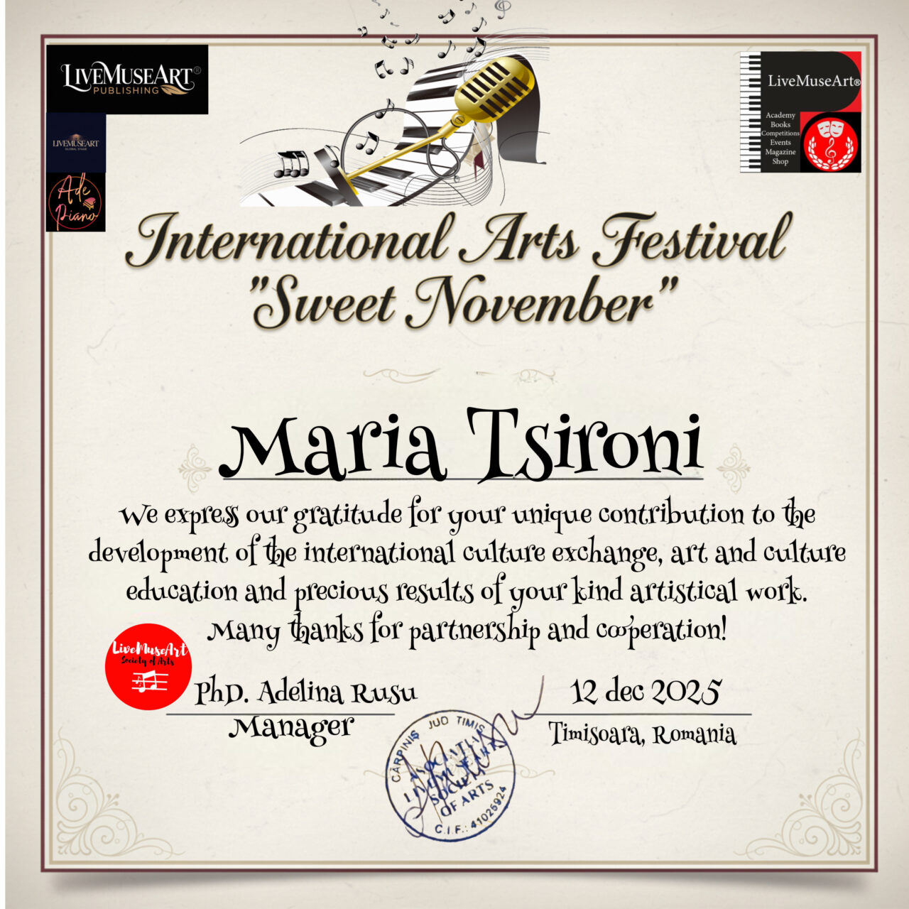 Το International Arts Festival “Sweet November” αποτελεί διεθνή πολιτιστική διοργάνωση που προάγει τη θεατρική δημιουργία και τη σύγχρονη καλλιτεχνική έκφραση.