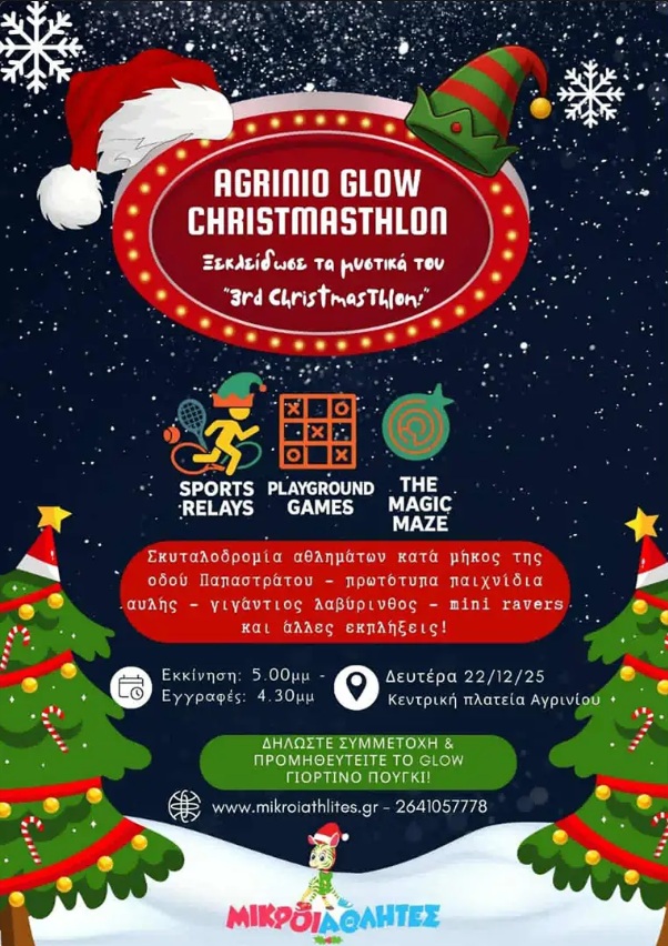 Το Αγρίνιο ετοιμάζεται να ζήσει μια μοναδική, φωτεινή χριστουγεννιάτικη εμπειρία, καθώς οι Μικροί Αθλητές διοργανώνουν το 3rd AgrinioGlowChristmasthlon, τη Δευτέρα 22 Δεκεμβρίου 2025, στην Κεντρική Πλατεία Αγρινίου.