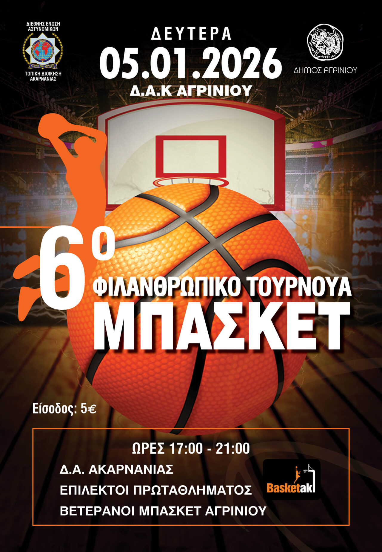 Το 6ο Φιλανθρωπικό Τουρνουά Μπάσκετ διοργανώνουν στο Αγρίνιο, η Τοπική Διοίκηση Ακαρνανίας της Διεθνούς Ένωσης Αστυνομικών και ο Δήμος Αγρινίου στις 5 Ιανουαρίου 2026.