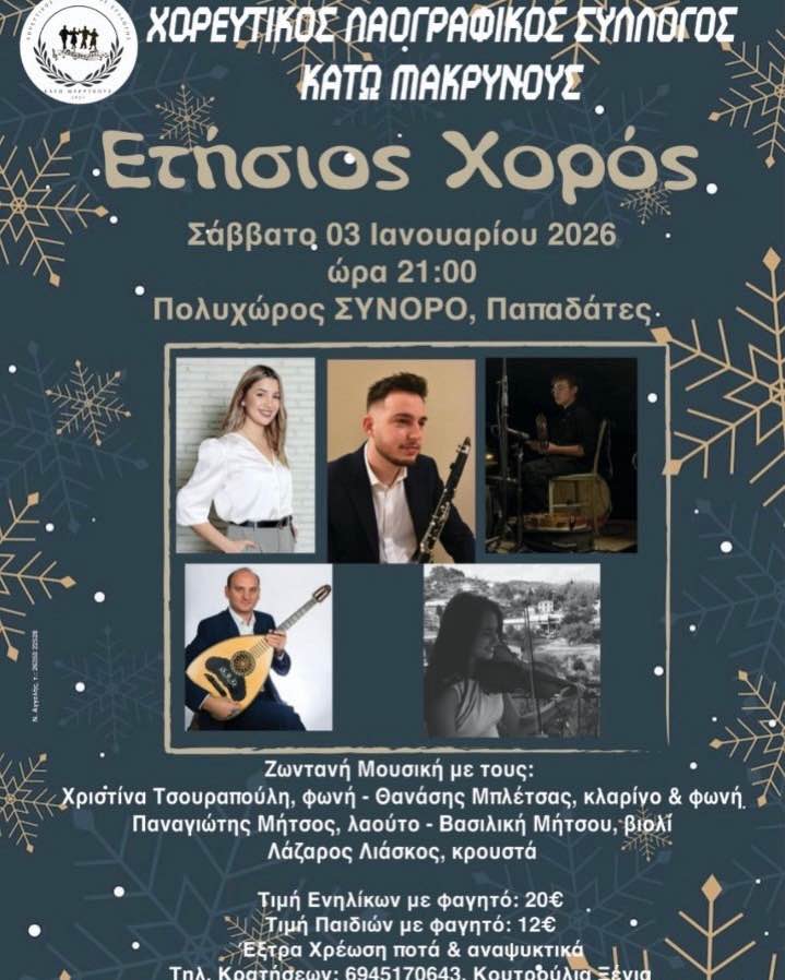 Ο Χορευτικός Λαογραφικός Σύλλογος Κάτω Μακρυνούς διοργανώνει τον Ετήσιο Χορό του το Σάββατο 3 Ιανουαρίου 2026, στον Πολυχώρο ΣΥΝΟΡΟ, στις Παπαδάτες, με ώρα έναρξης 21:00.